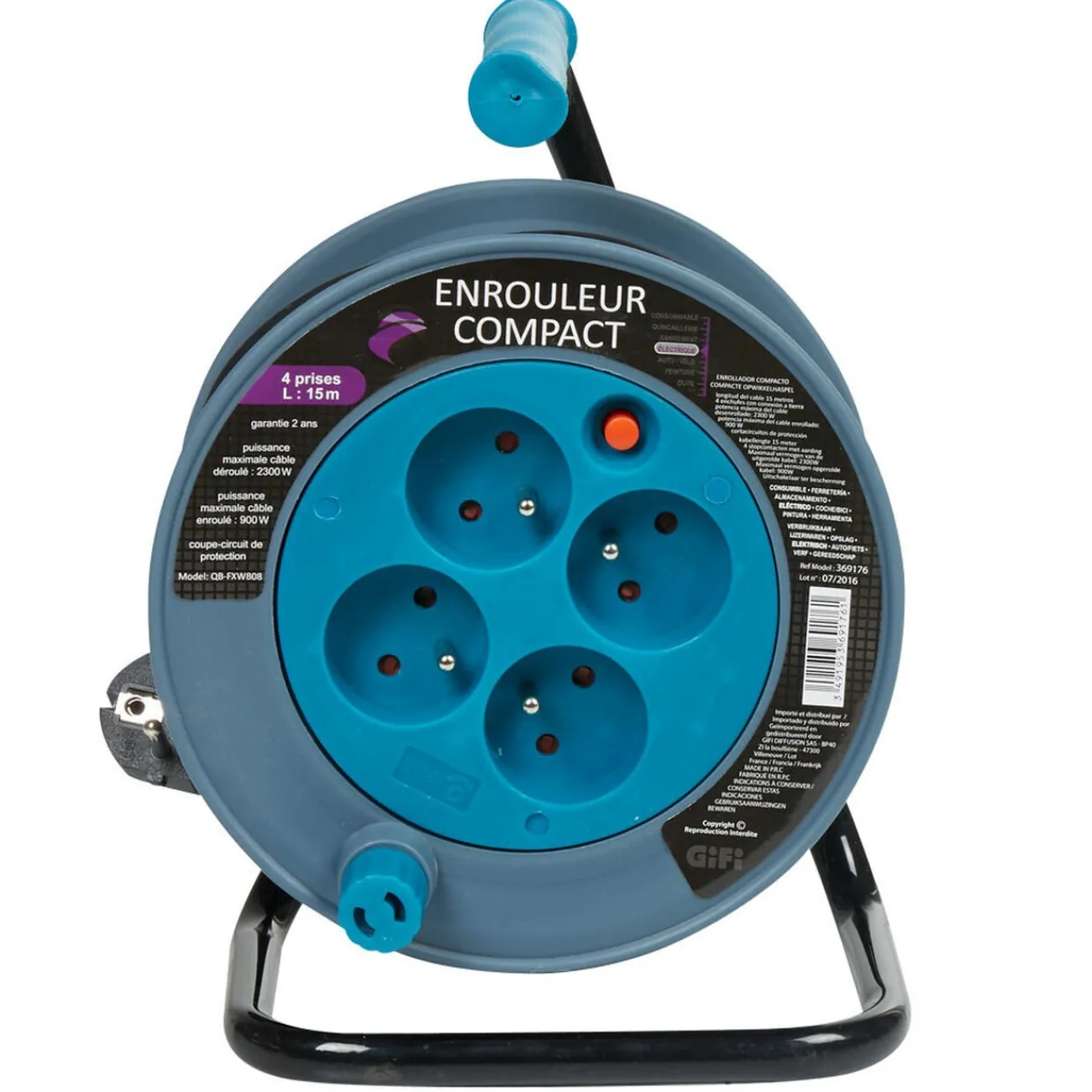 Enrouleur 4 prises bleu et gris, L.15 m, di.24,5x18x16 cm, polypropylène..