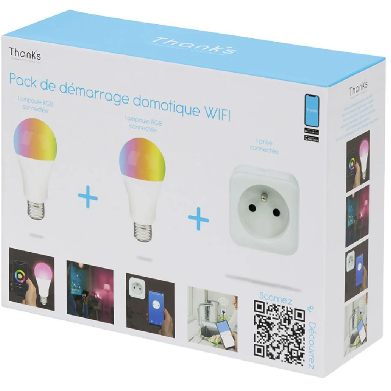 Pack de démarrage composé de 2 ampoules et une prise connectées, idéal pour tester notre univers connecté Thank’s.