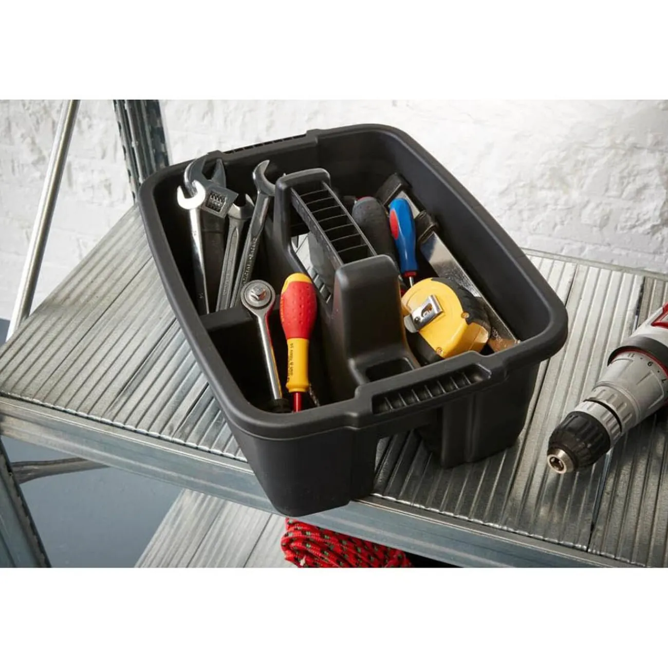 Caisse multiusage noire avec poignée sur le dessus pour plus de praticité. Idéale pour y ranger et garder à portée de main vos outils, vos produits de toilettage d’animaux, les produits d’entretien des voitures, etc.