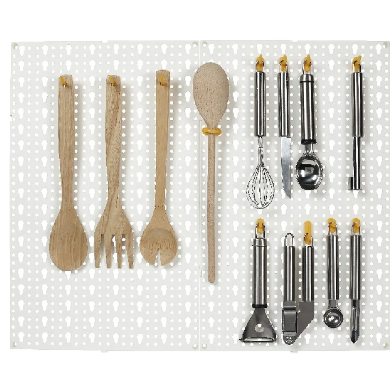 Gagnez de l’espace de rangement avec ce panneau mural perforé, facile à installer grâce à son kit de fixation inclus. Les 22 crochets assortis, clipsables à l’infini vous permettront de suspendre n’importe quelle fourniture. Accrochez-y les outils, les ustensiles de cuisine ou encore les accessoires de coiffure.