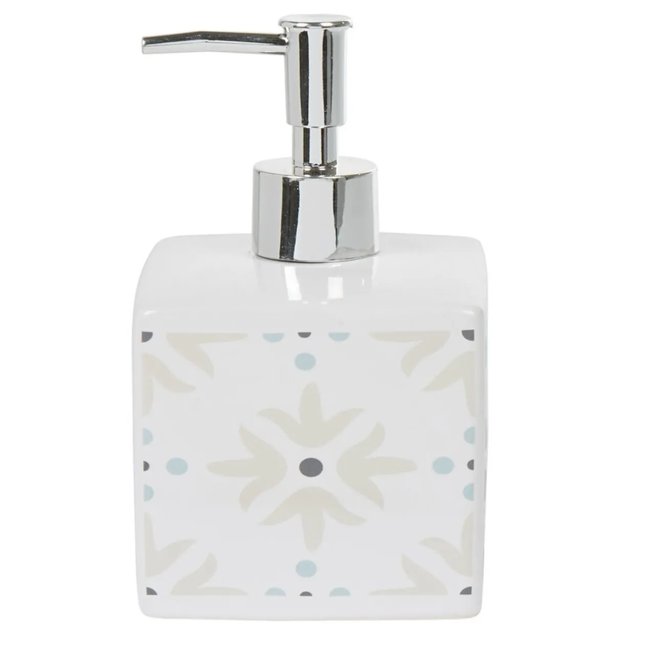 Distributeur à savon pour la salle de bain blanc design carreau de ciment beige/bleu/gris.