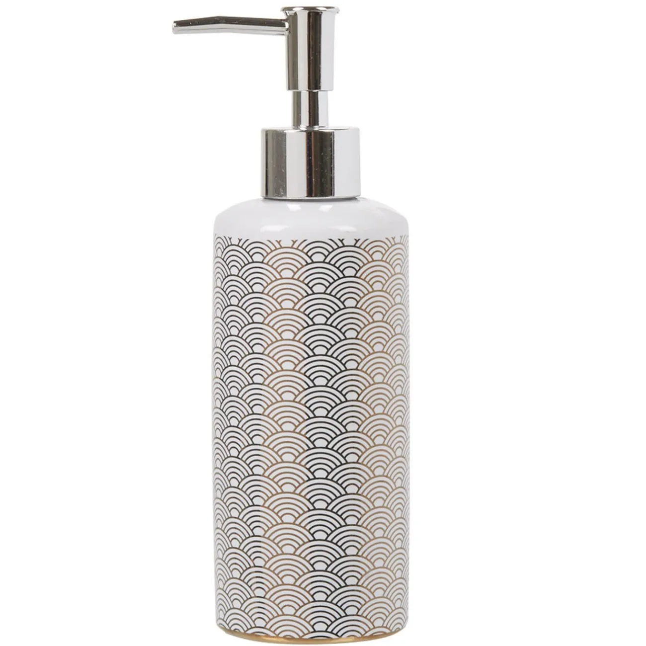 Ce distributeur de savon en céramique à motif écaille blanc et doré sublimera la décoration de votre salle de bain.