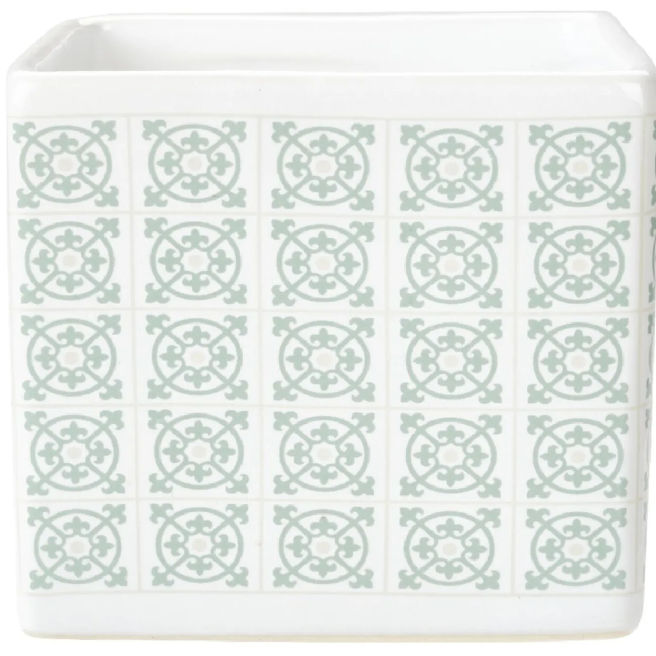 Gobelet de salle de bain carré en céramique décor carreau de ciment blanc et vert.