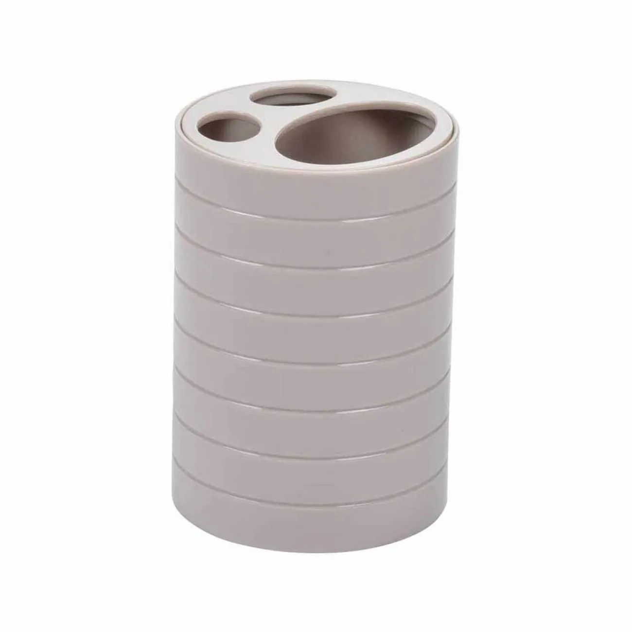 Gobelet avec support pour brosse à dents et dentifrice, en plastique de couleur taupe et au design strié.