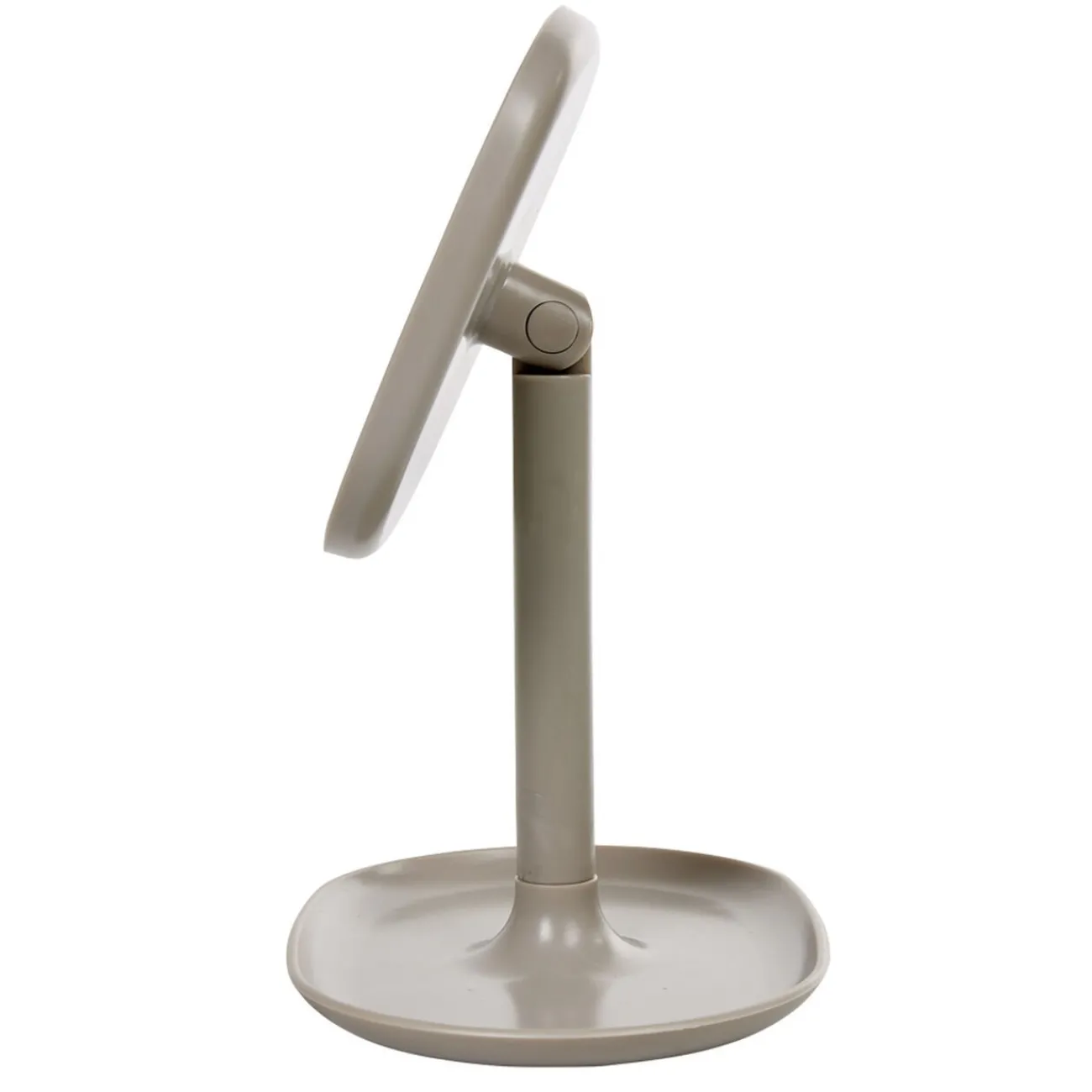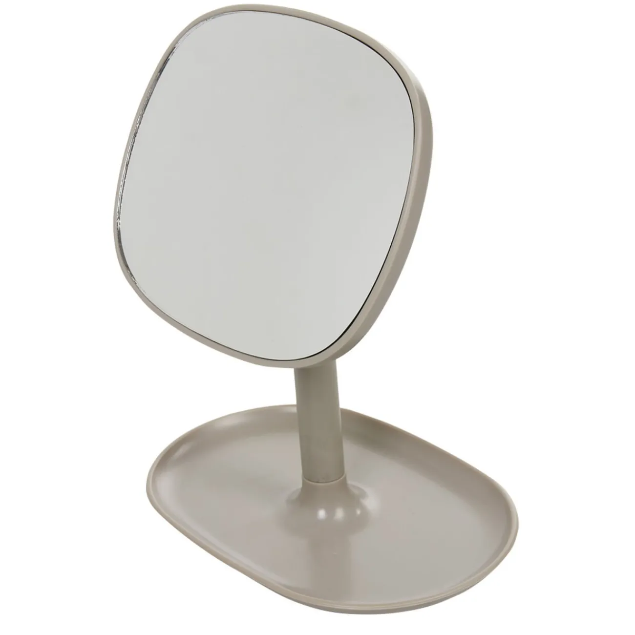 Miroir POP inclinable de couleur gris taupe sur pieds pouvant faire office de repose bijoux ou accessoires.