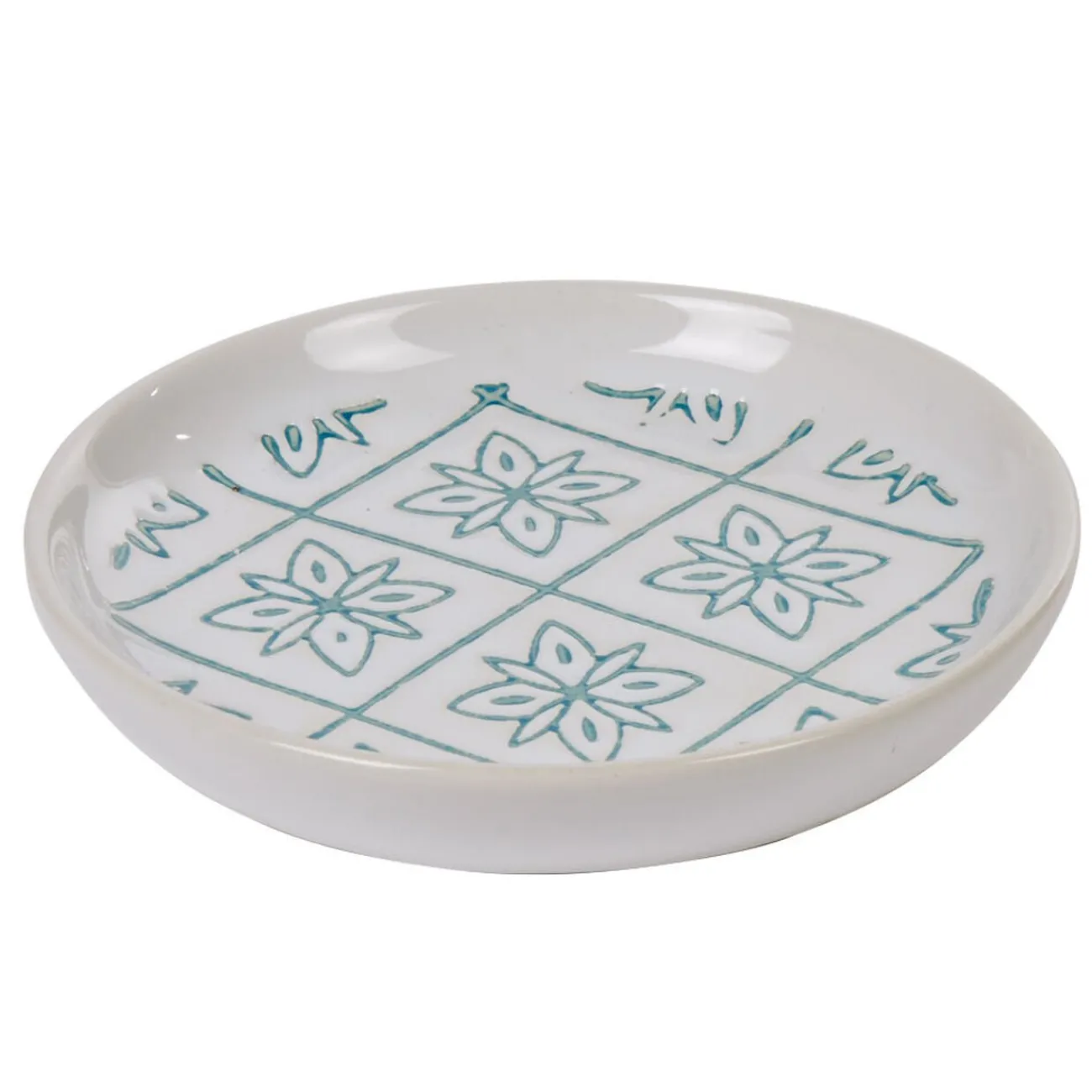 Optez pour ce porte-savon en céramique blanche avec motif en relief rosace et losange bleu.
