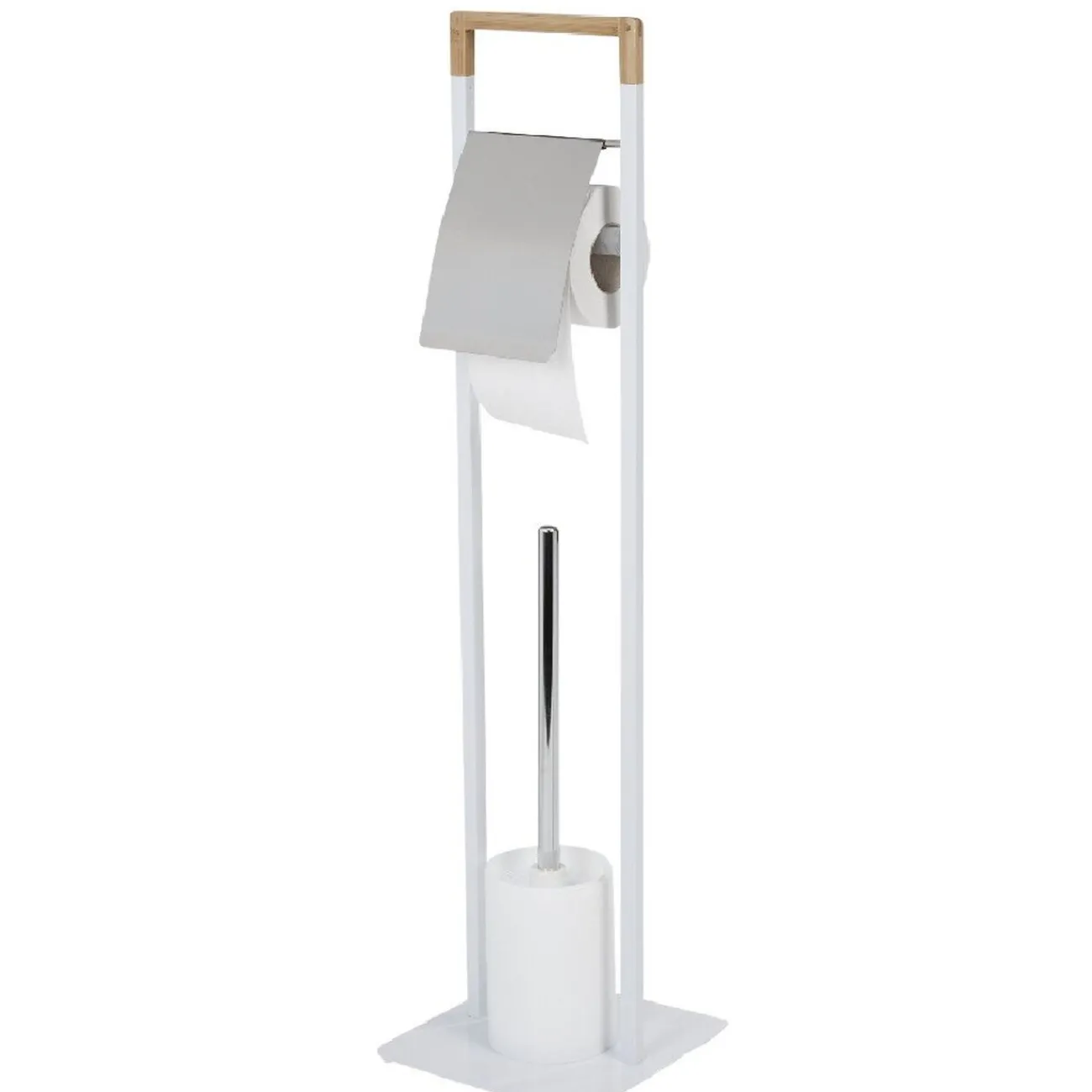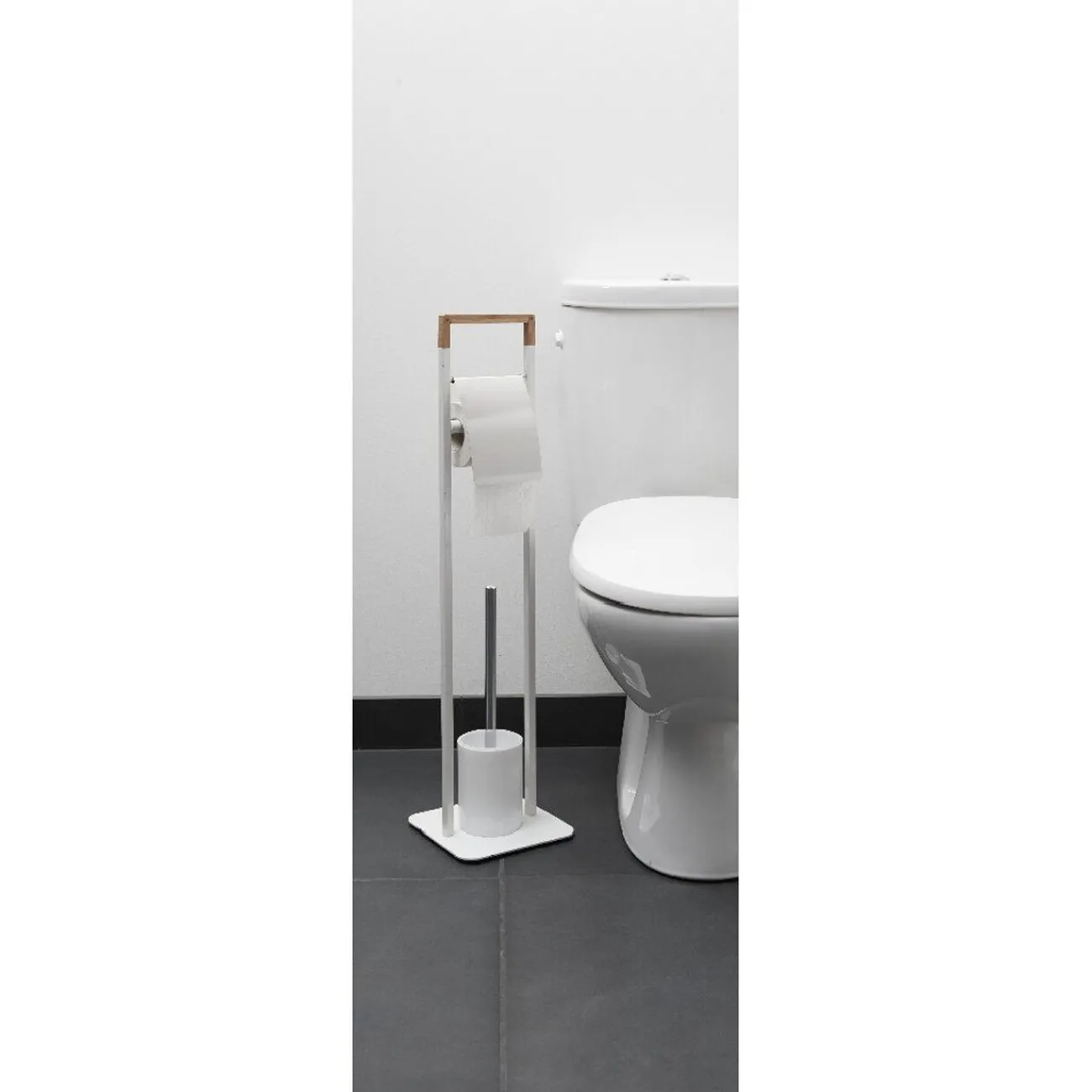 Serviteur pour WC en plastique blanc et couleur bois, il comprend un dérouleur papier ainsi qu’une brosse WC.