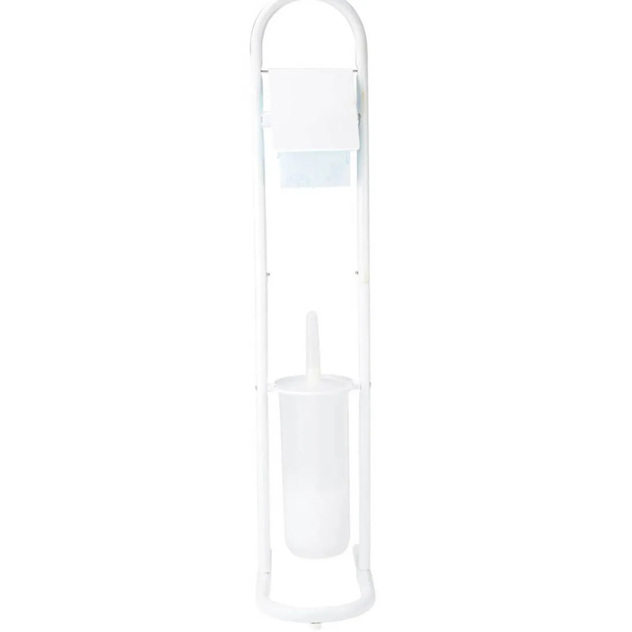 Serviteur WC blanc avec une brosse et un support pour papier toilettes. L’indispensable aux latrines !