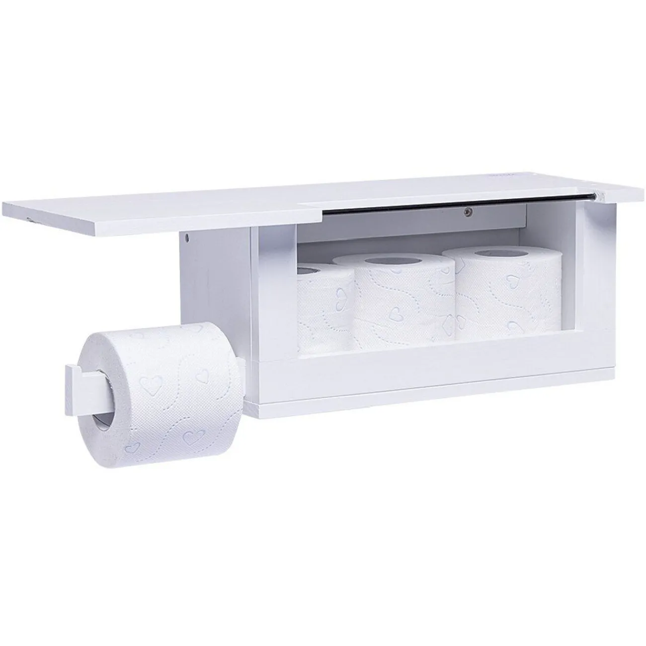Cette tablette dérouleur de papier toilette en bois blanc fera un support pratique et élégant pour votre cabinet.