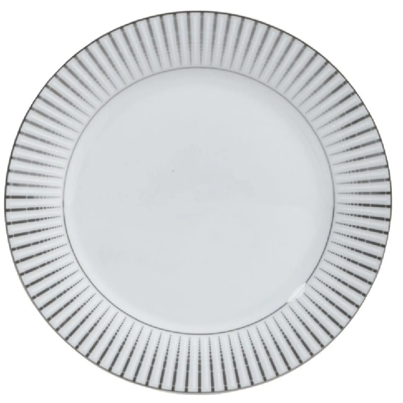 Assiette à dessert en porcelaine à motifs argentés, pour apporter une touche d’éclat à votre table. Complétez votre service en retrouvant l’assiette creuse assortie, référence 369058, l’assiette plate, référence 369056, ainsi que le saladier, référence 369054, selon disponibilité en magasin.