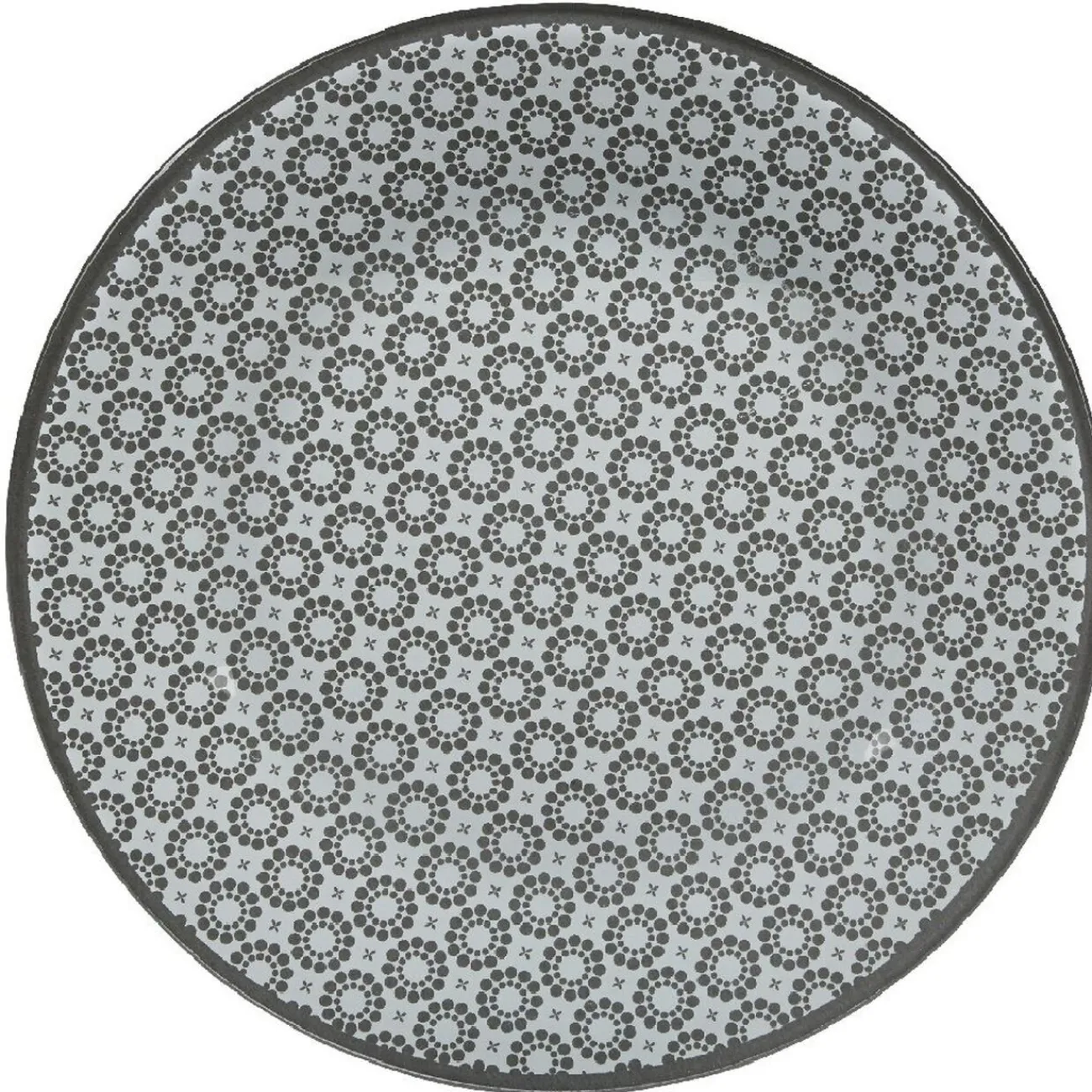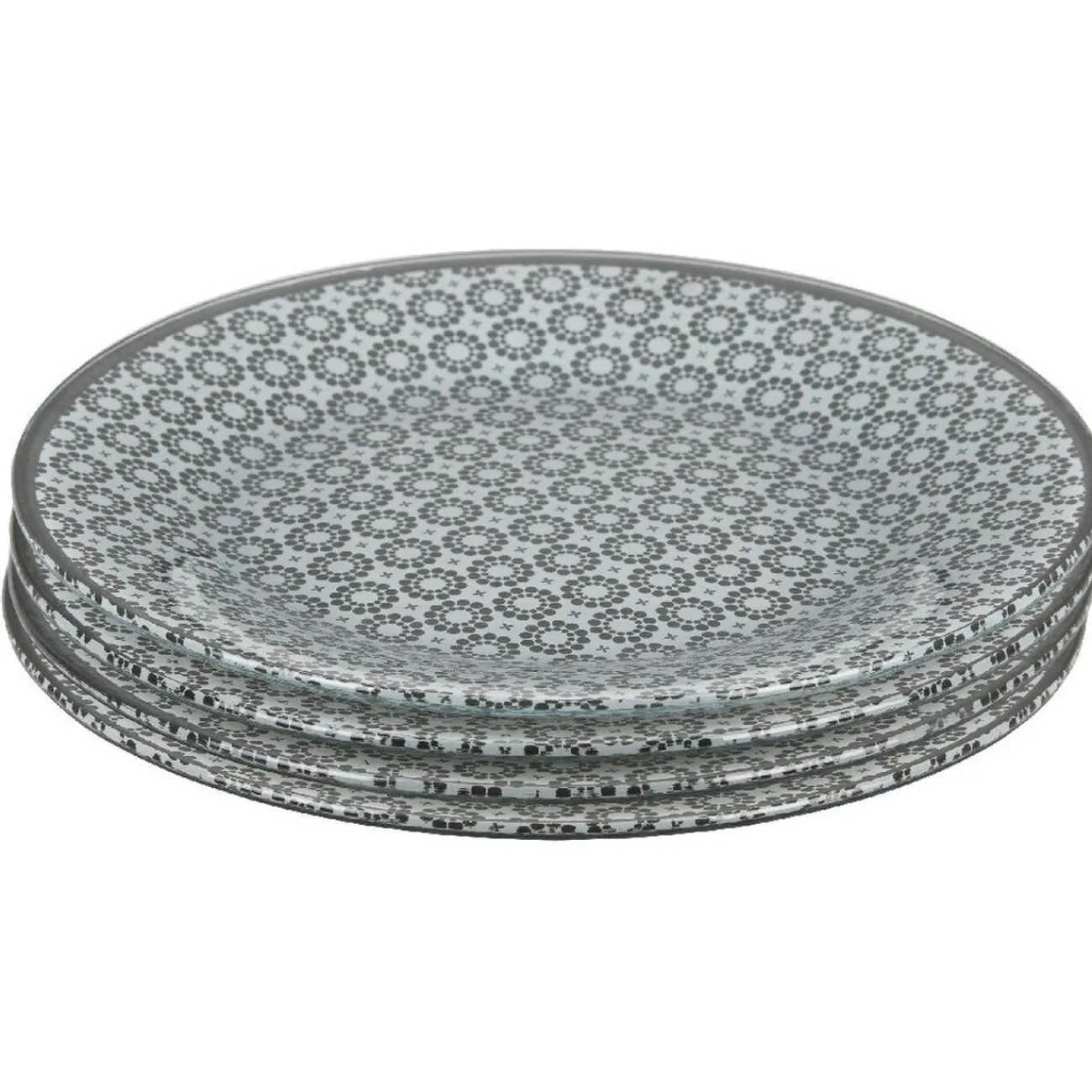 4 assiettes à dessert Micro de couleur blanc, motifs pois en forme de fleurs noires.
