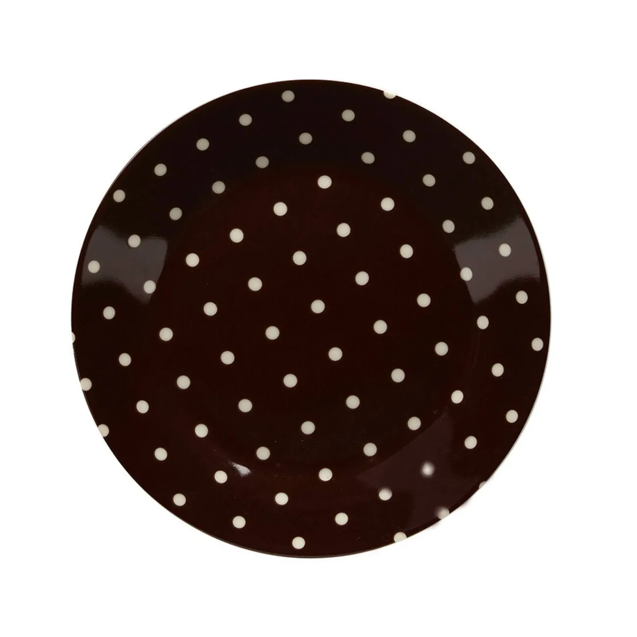 Assiette à dessert en porcelaine marron chocolat à pois de couleur ivoire.
