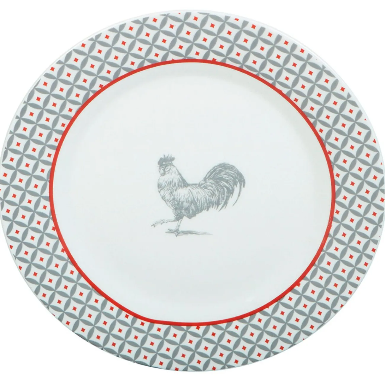 Assiette à dessert ronde design poule et rebord motifs triangulaire de couleur blanche, grise et rouge.