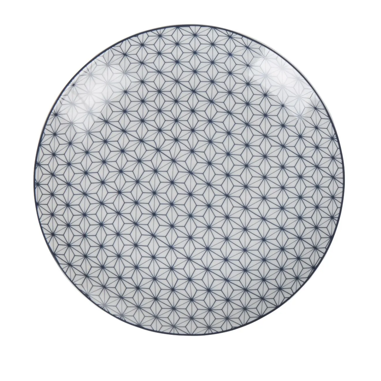 Assiette plate blanche avec motifs géométriques style prisme bleus foncés.