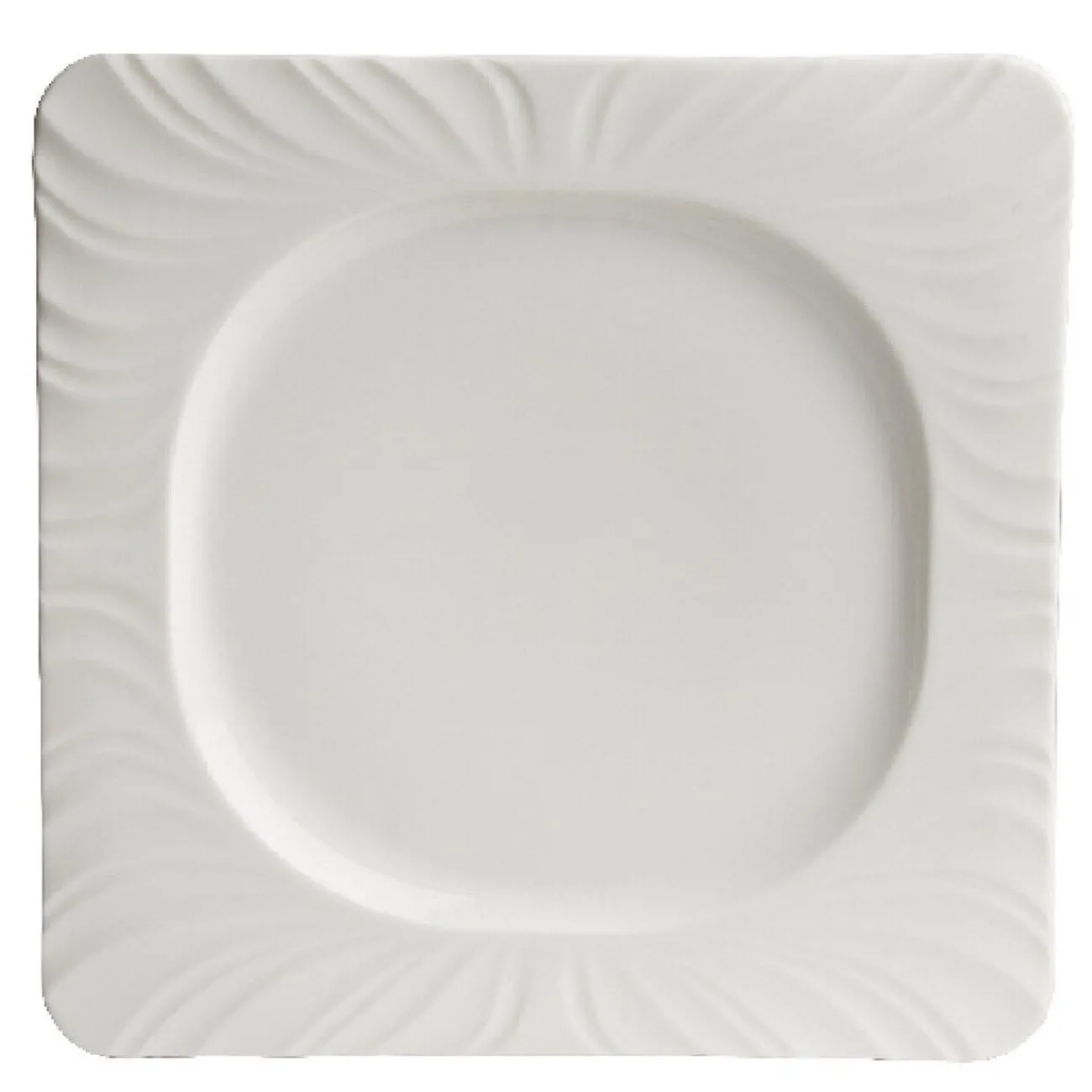 Assiette plate Feston carrée avec rond à l’intérieur et bords arrondis de couleur blanche.