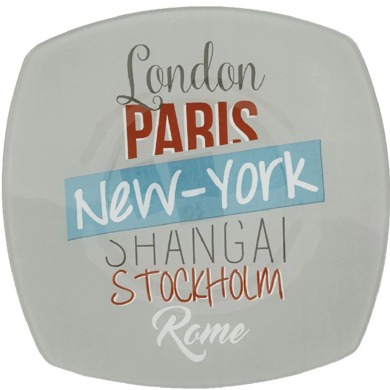 Assiette plate carrée à bord arrondi design city avec inscription « London, Paris, New York, Shangai, Stockholm, Rome ».
