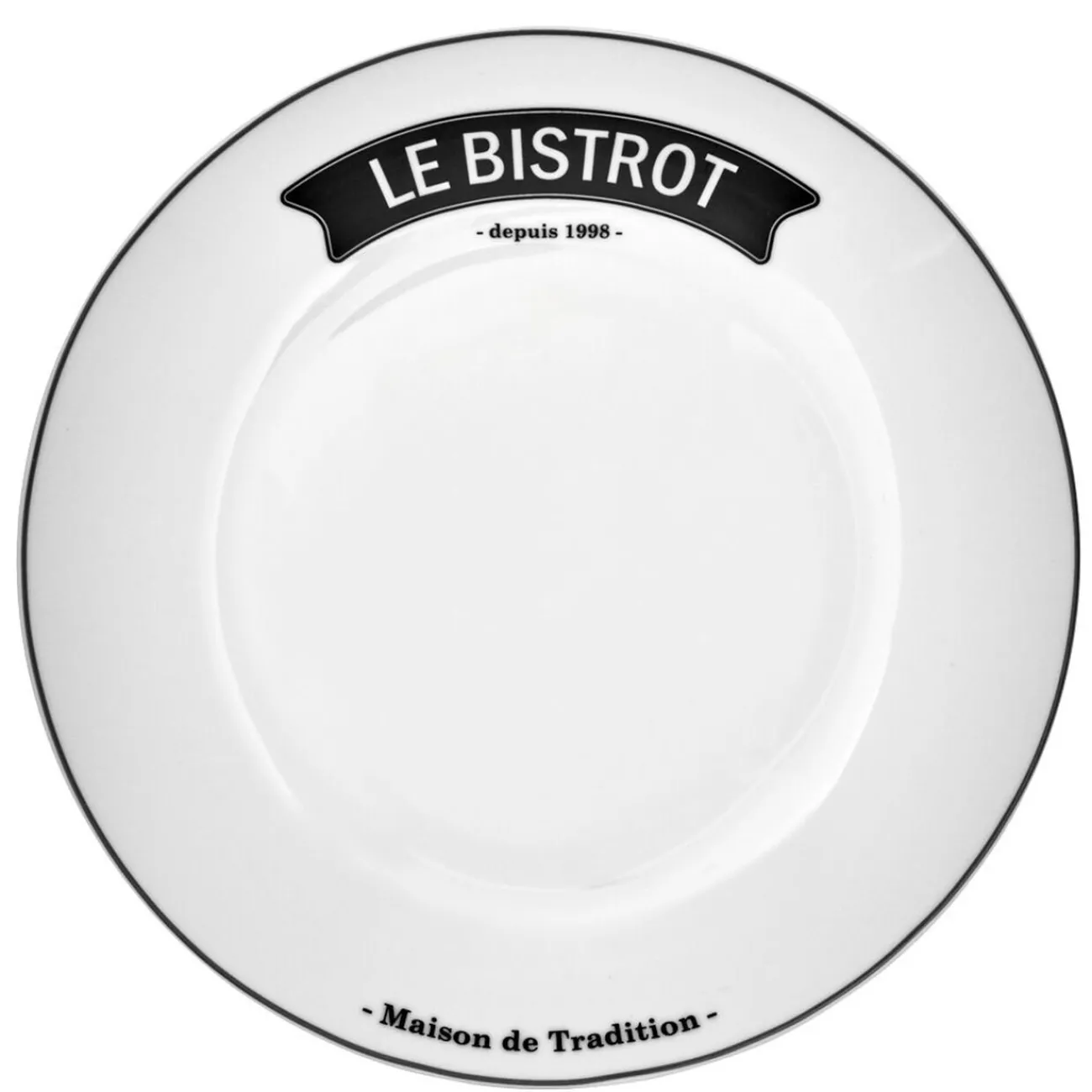 Assiette plate blanche de forme ronde avec inscription noire « Le Bistrot ».
