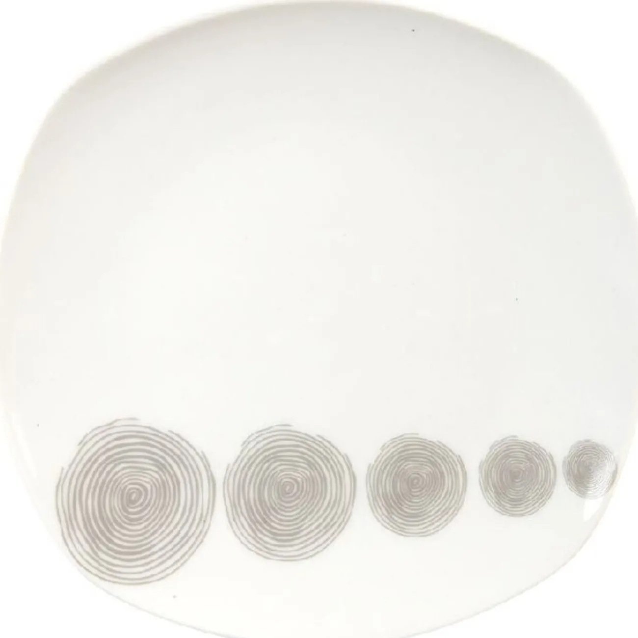 Assiette plate carrée en porcelaine de dimension 25 x 25 cm et de couleur blanche avec motif tourbillons gris.