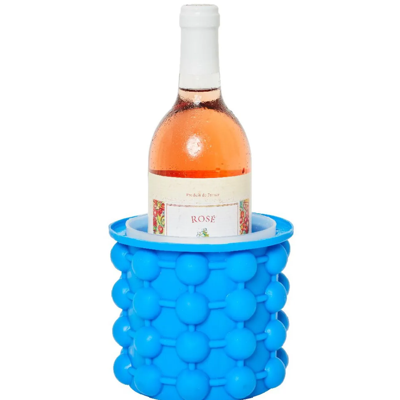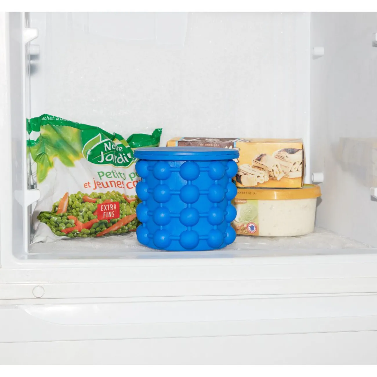 Bac à glaçons bleu en silicone. Emplacement pour mettre une canette ou une bouteille au milieu et faire les glaçons tout autour, refermable avec un couvercle.