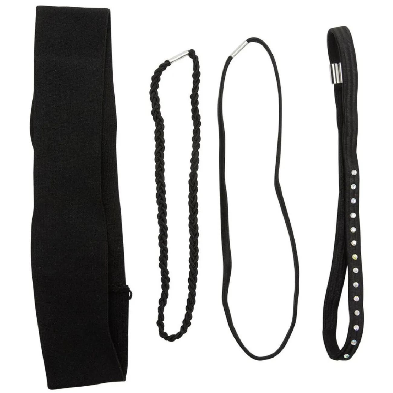 Lot de 4 bandeaux pour accessoiriser vos cheveux en différentes coiffures: 1 en maille large et les 3 autres élastiques, tressé, à strass et fin noir.