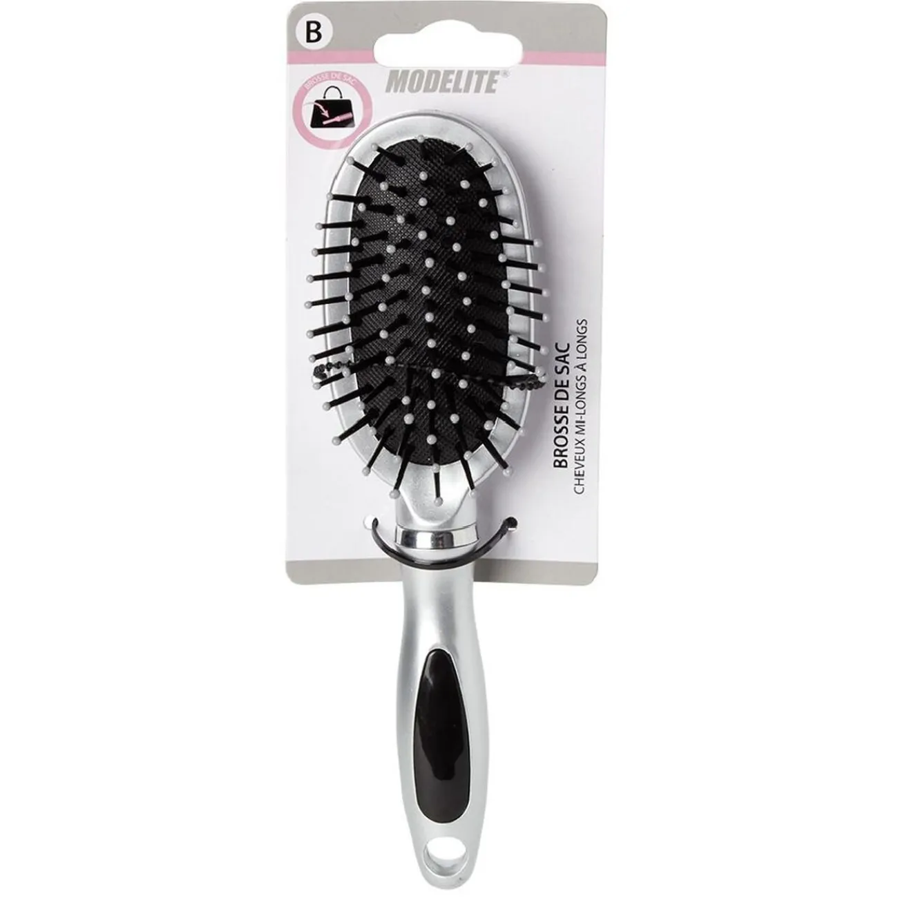 Brosse pneumatique ovale avec picots en pvc noir perlés. Format compact pour sac.