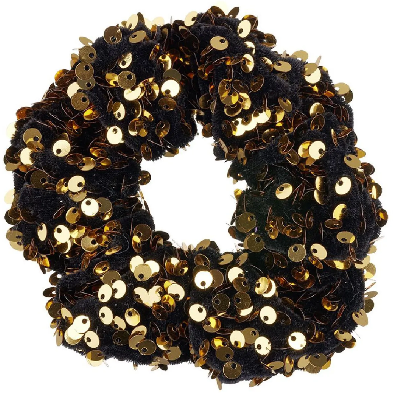 Chouchou en polyester décoré de sequins noirs et dorés.