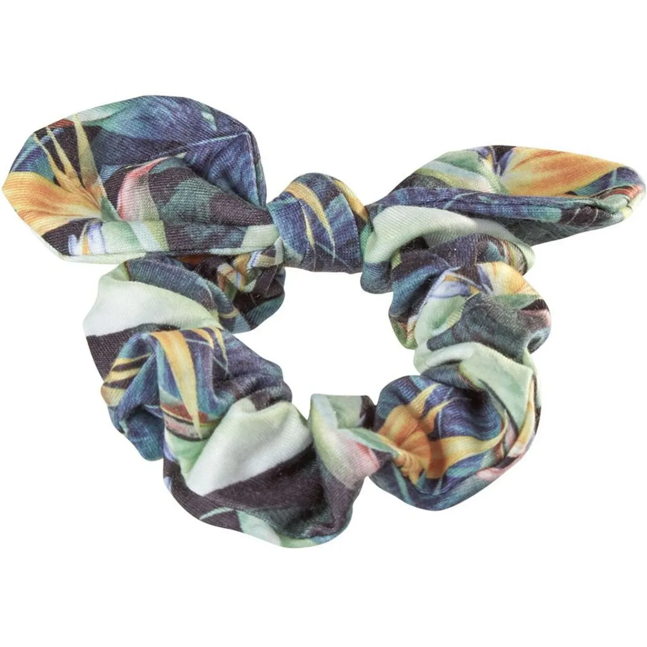 Chouchou effet foulard noué en polyester imprimé style tropical.