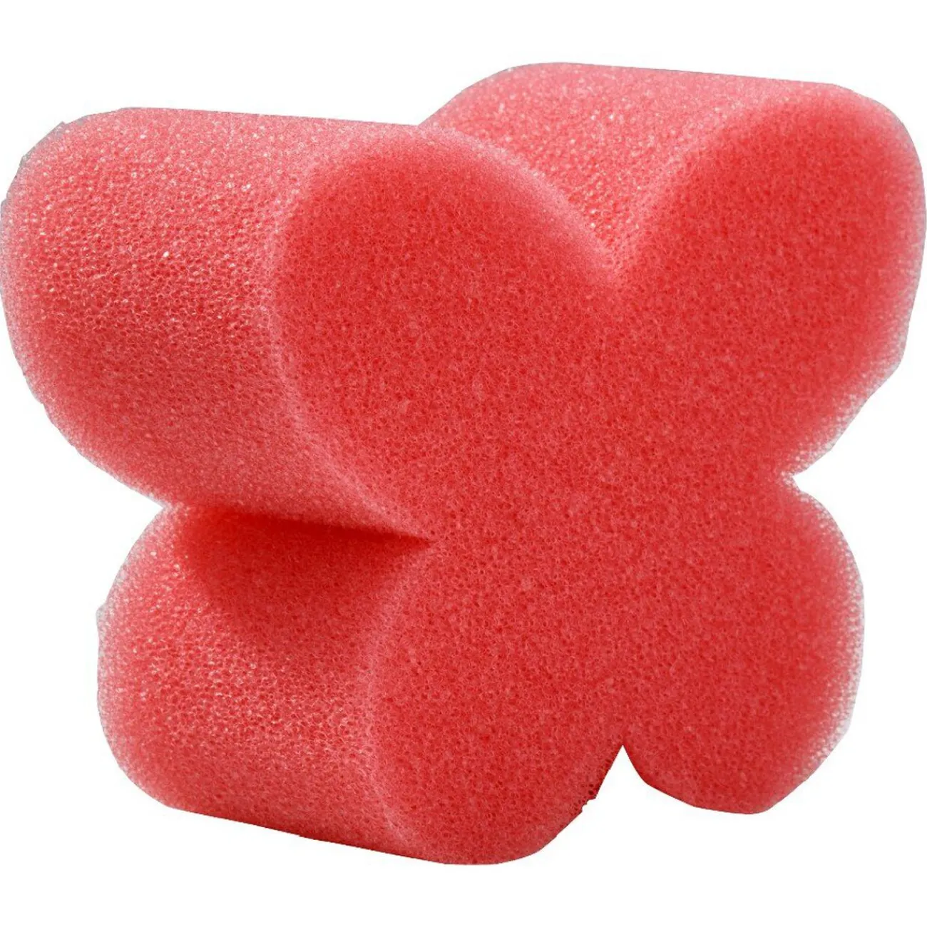 Lot de 4 éponges de bain en mousse de différentes formes et colorées jaune, vert, rouge et rose.