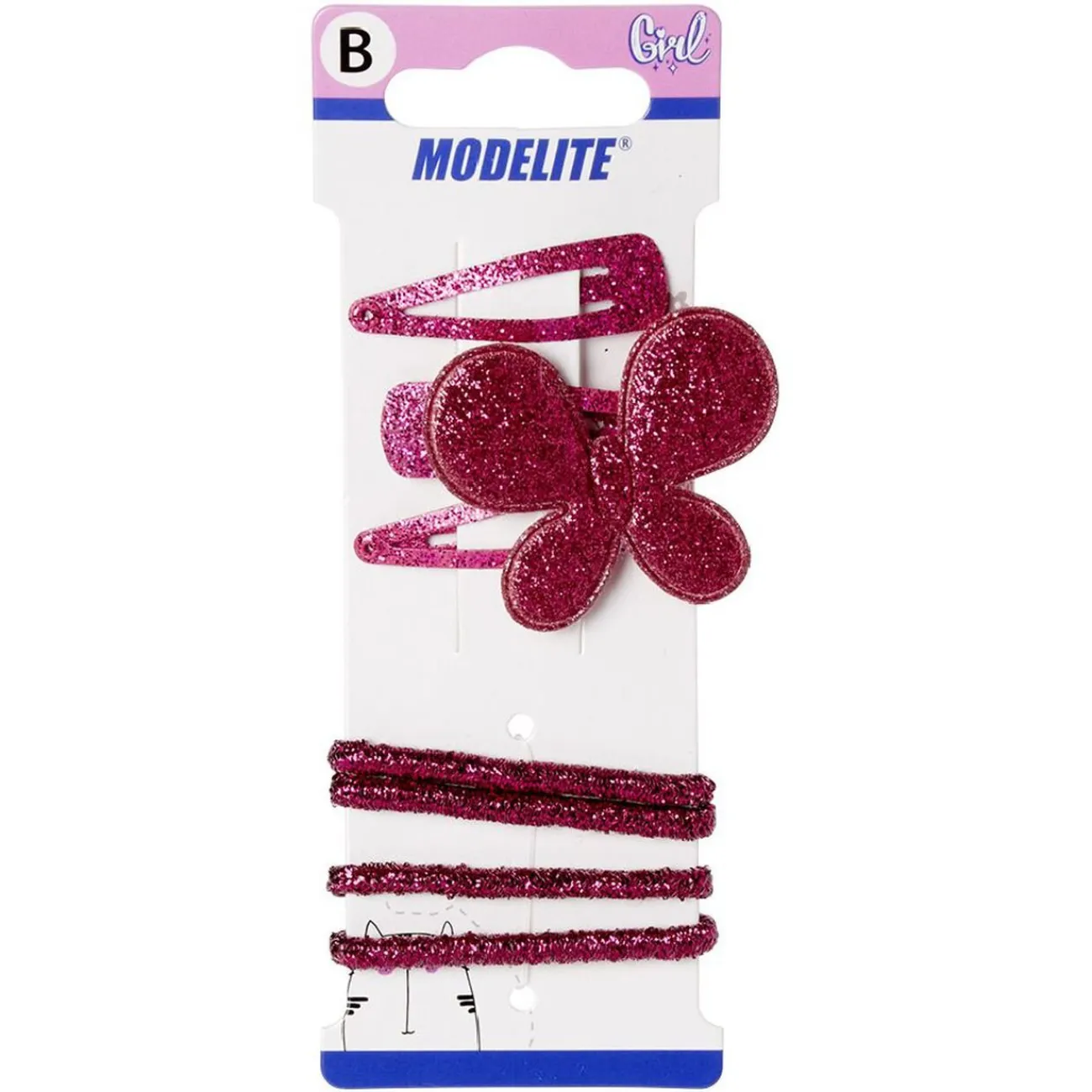 Kit de coiffure rose pailleté comprenant 4 élastiques et 3 barrettes clic clac dont 1 avec décor assorti.