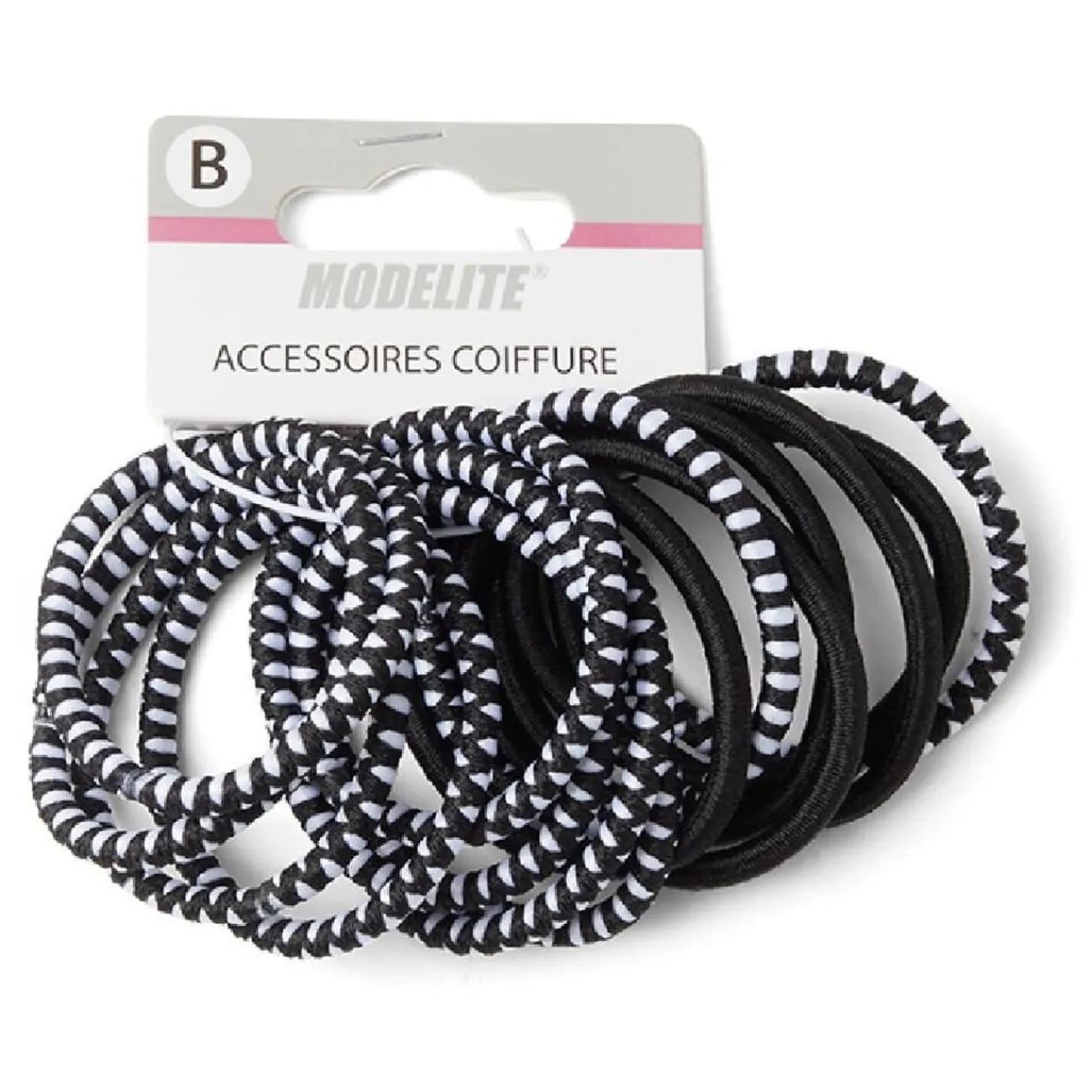 Lot de 15 élastiques à cheveux en polyester, comprenant 10 élastiques à motif noir et blanc et 5 entièrement noirs.