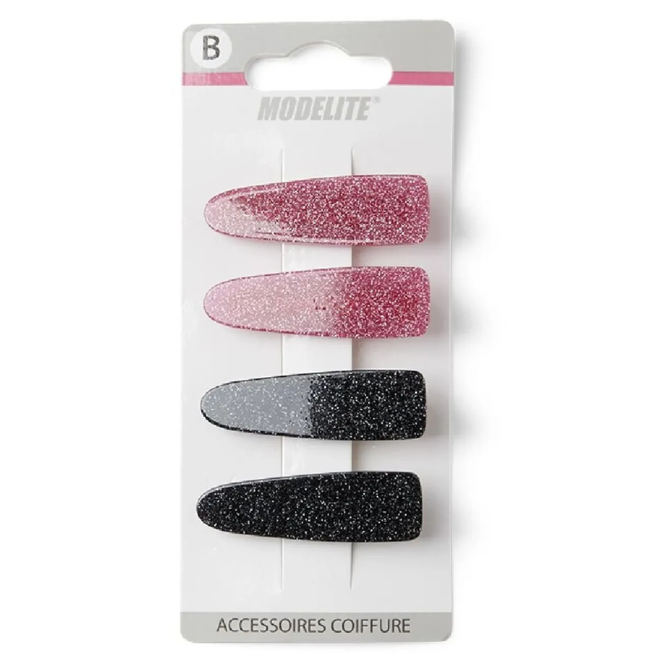 Lot de 4 pinces à cheveux plates crocodile à paillettes, comprenant 2 pinces de coloris noir et 2 pinces de coloris rose.