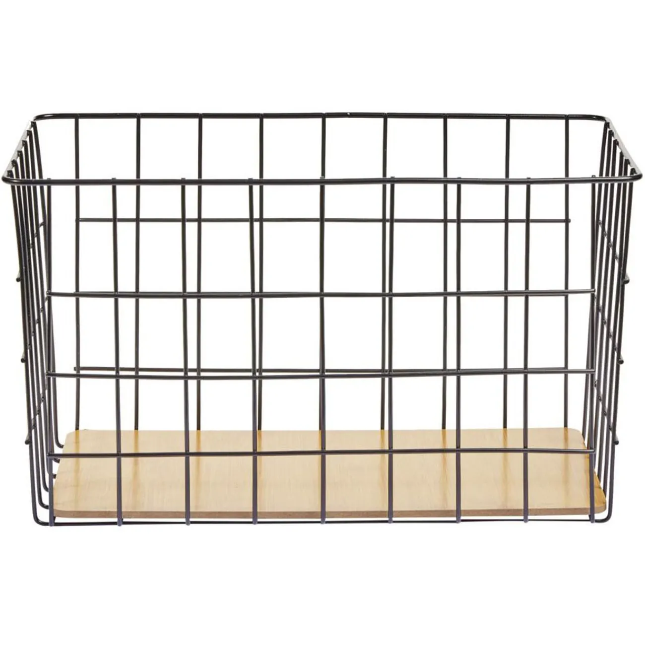 Panière en acier ajouré noir avec fond en bois, idéale pour optimiser le rangement de votre pièce que ce soit votre salon, votre salle de bain ou votre chambre.