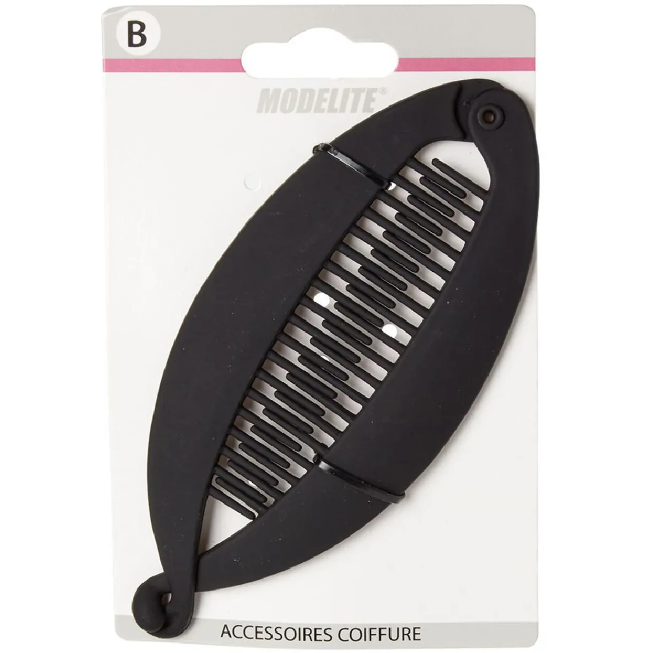 Pince à cheveux forme banane en plastique uni noir. Longueur : 14 cm