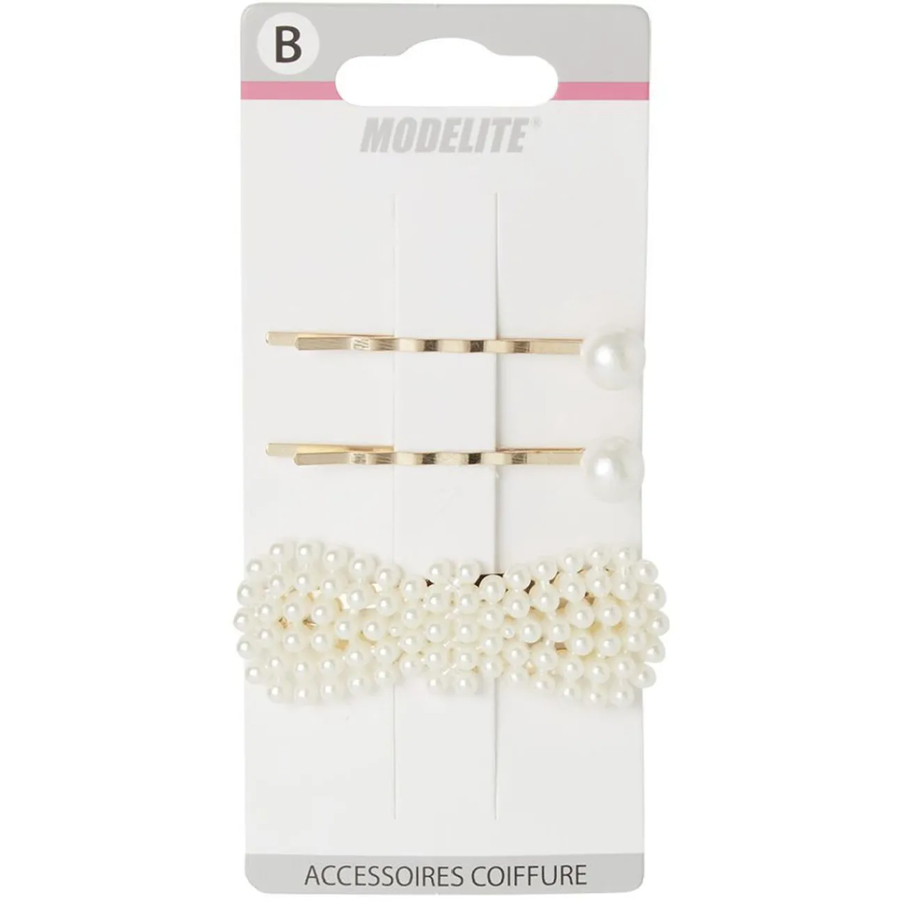 Lot comprenant 2 pinces guiches et 1 pince clic clac décorées de perles d’imitation blanches.