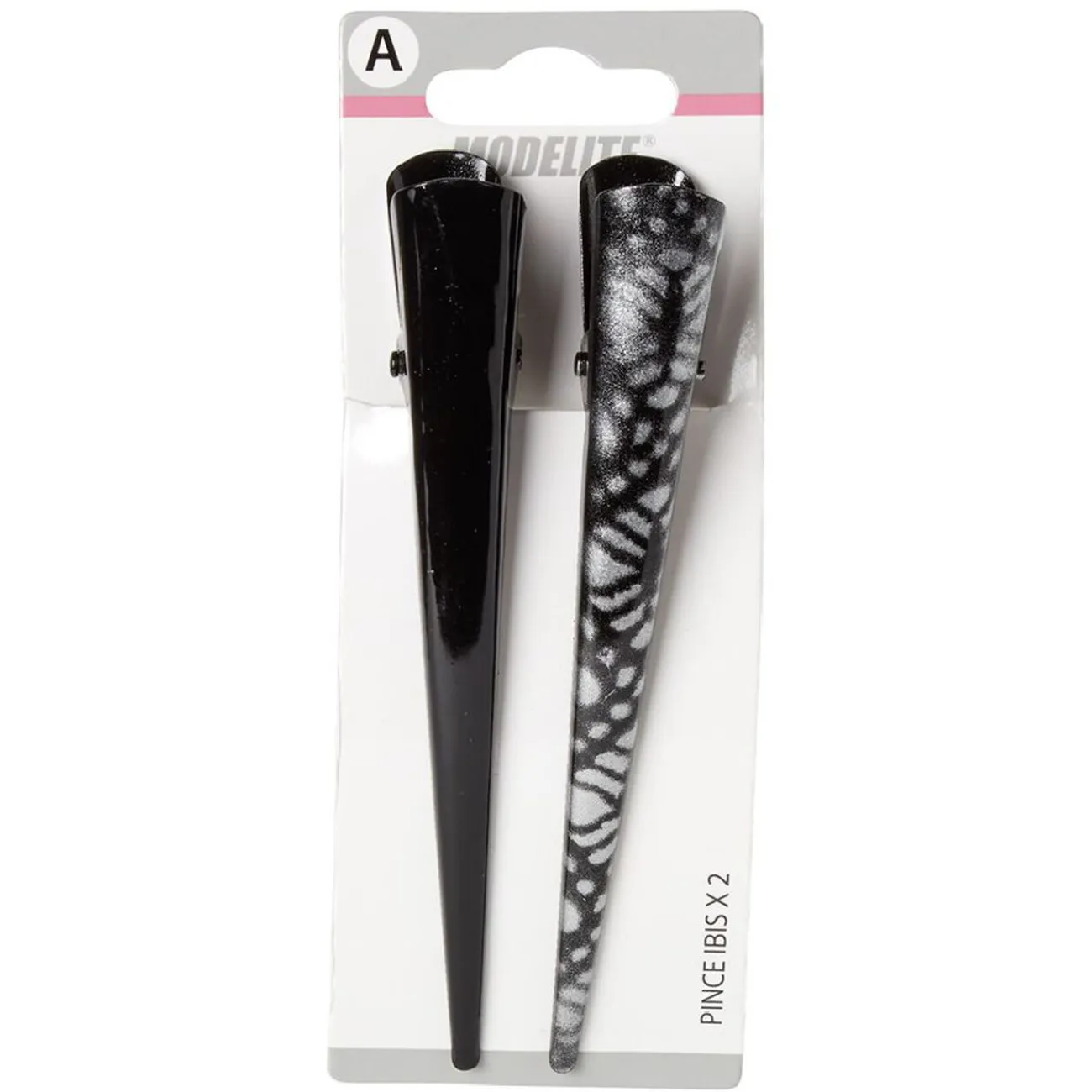 Lot de 2 pinces Ibis en métal uni noir et imprimé noir et gris argenté.