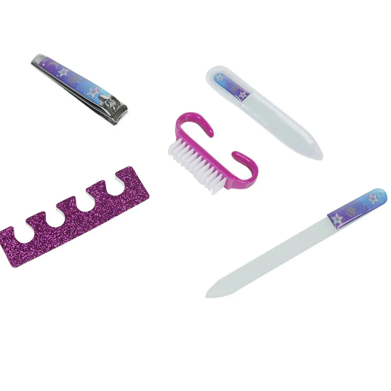 Set de manucure design Cosmos violet comprenant une grande et une petite lime, un coupe-ongle, un séparateur et une brosse.