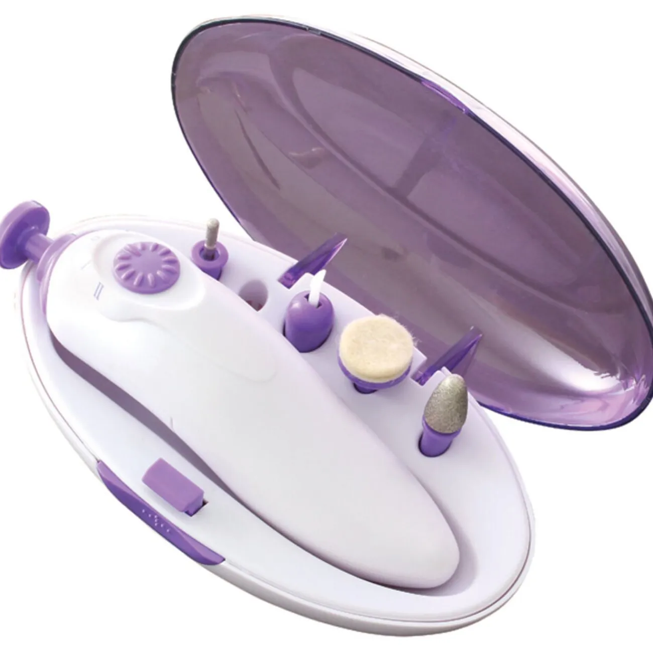 Set manucure et pédicure comprenant 5 accessoires : 2 disques de limage, 1 disque de polissage, 1 repousse cuticules et 1 embout large de limage. Stylet ergonomique, double sens de rotation, 2 vitesses, fonctionne avec 2 piles LR06 non fournies. Dim. 14×4 cm..