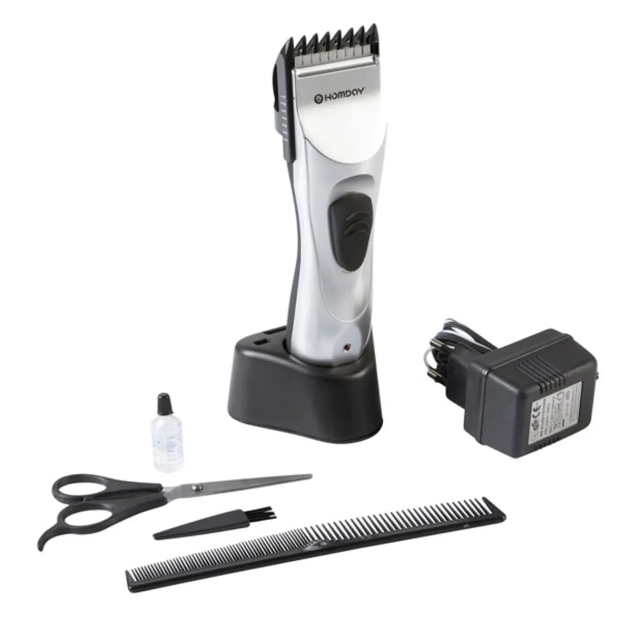 Tondeuse à cheveux avec lames de précision d’une puissance de 12 Watts qui vous permettra de réaliser des coupes différentes grâce à son réglage de coupe ajustable (de 3 mm jusqu’à 9 mm).Accessoires inclus : 4 sabots, 1 peigne, 1 paire de ciseaux et 2 produits d’entretien.Fonctionne sur secteur 220-240 V. 50 Hz..