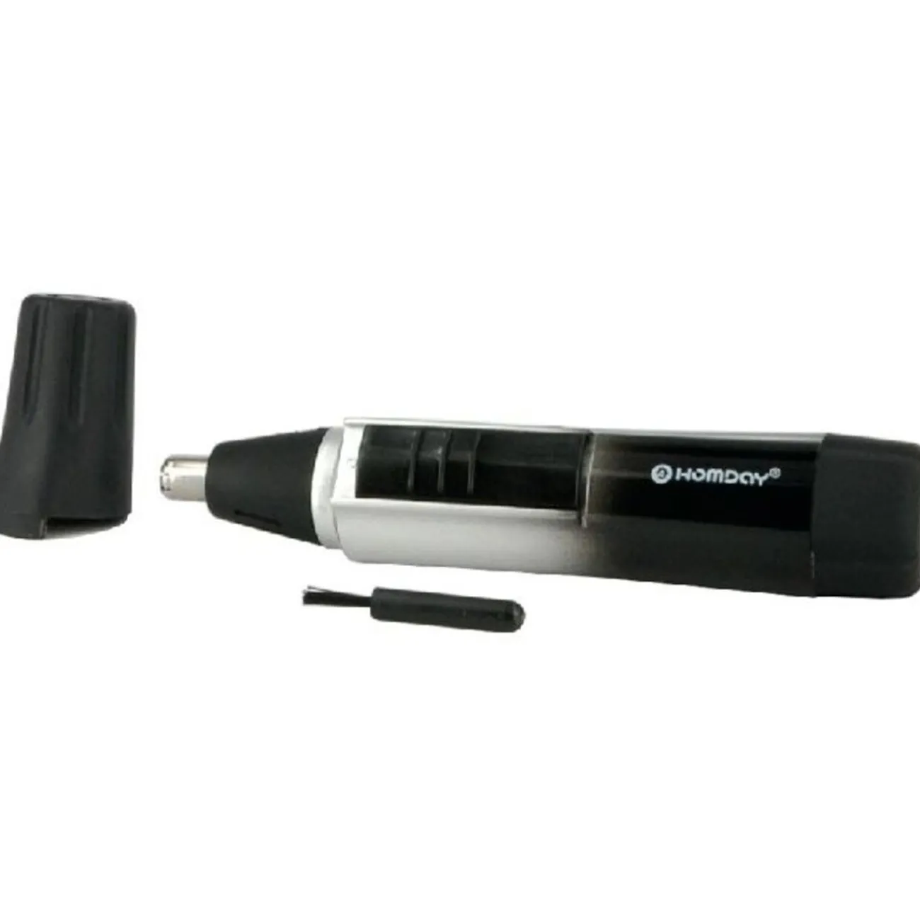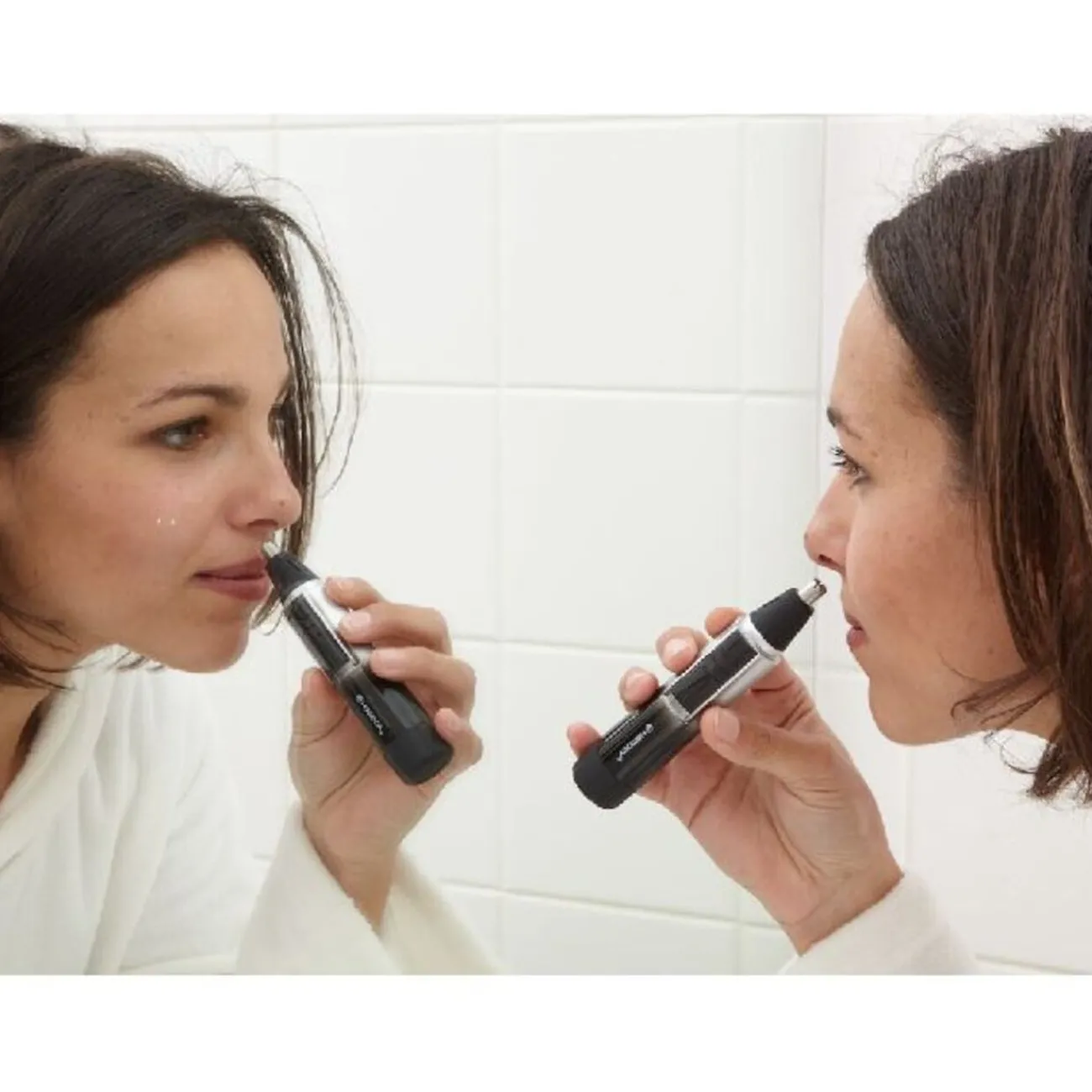 Tondeuse nez et oreilles, idéale pour voyager, puissance 3W, fonctionne avec 1 pile LR06 non incluse. Facile à nettoyer, sac de transport et brosse de nettoyage inclus..