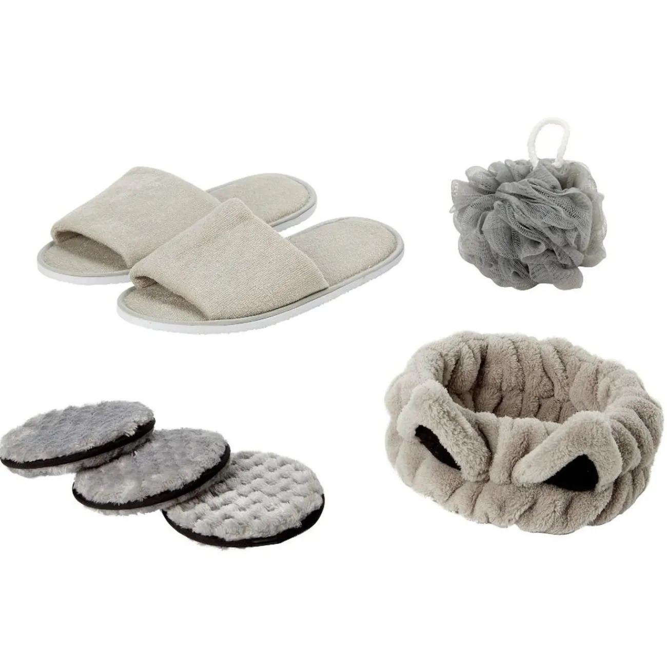 Coffret de bain 4 pièces contenant 1 paire de chaussons de bain, 1 bandeau de douche, 1 fleur de douche et 2 disques démaquillants réutilisables.