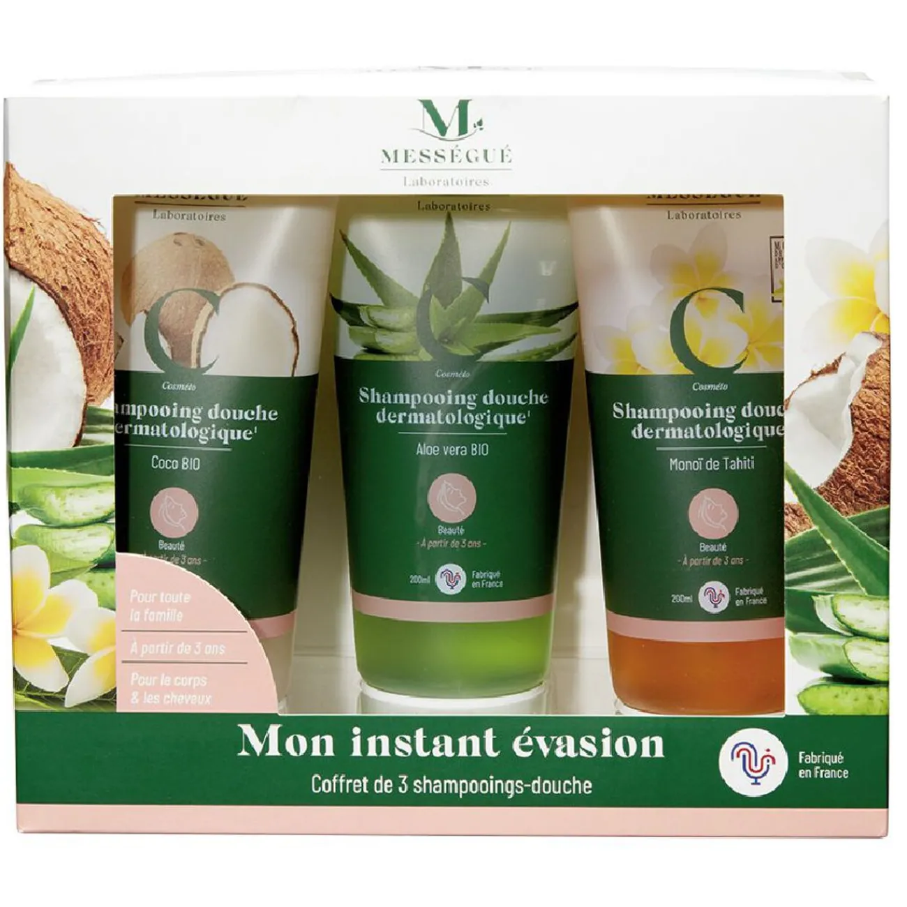 Coffret de 3 shampoings-douche Instant évasion de Mességué en flacon pompe de 200 ml.