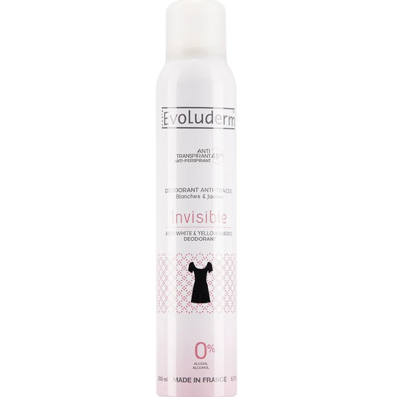 Déodorant Evoluderm invisible, une formule anti-traces sans sels d’aluminium et efficace durant 48 heures.