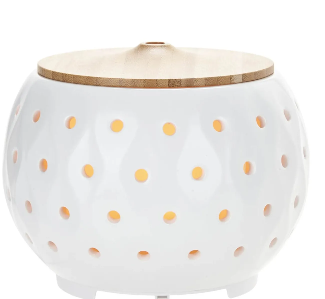 Diffuseur d’huiles essentielles ultrasonique Mességué. Avec une contenance de 200 ml, de forme ronde en céramique avec couvercle en bois, il vous offrira une longue et agréable diffusion tout en apportant une touche zen à votre intérieur. De plus, son design lumineux qui change de couleurs jusqu’à 4 différentes apportera de la couleur et de l’originalité à votre déco.