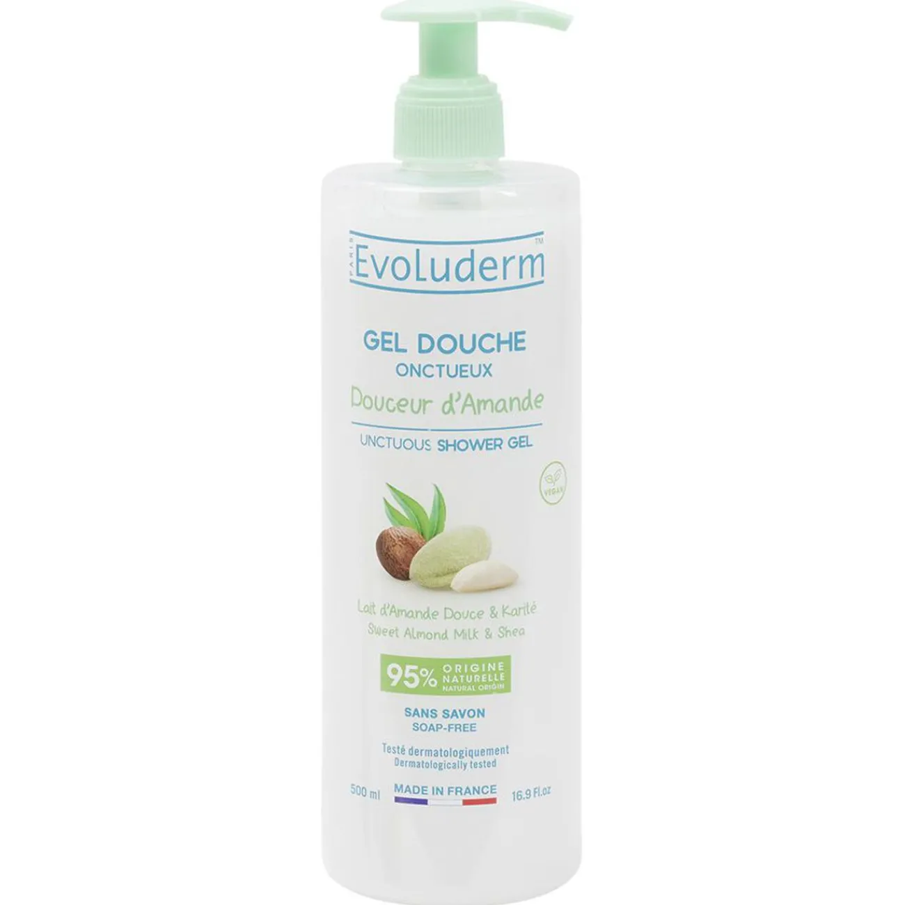 Le gel douche Evoluderm à base d’huile d’amande douce et de karité aux notes vanillées nettoie avec délicatesse la peau et apporte de l’élasticité à l’épiderme.