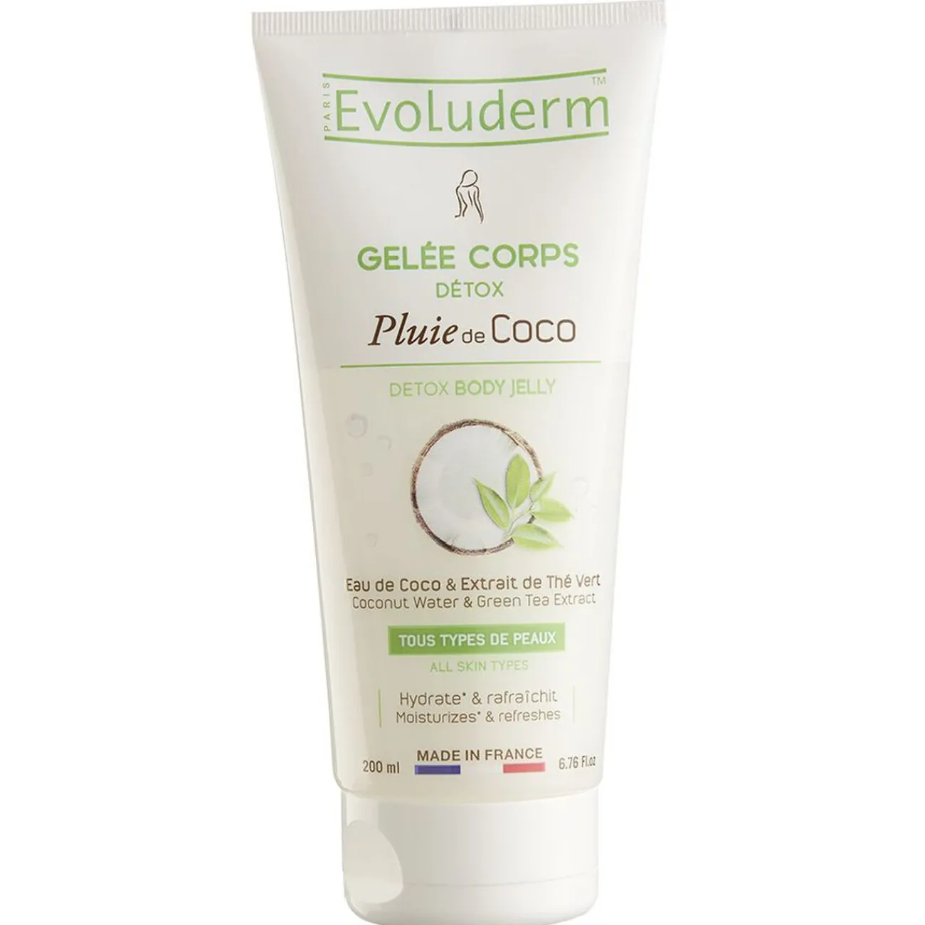 Gelée désaltérante et détoxifiante à l’eau de coco et aux extraits de thé vert pour faire barrage aux toxines sans agresser la peau.