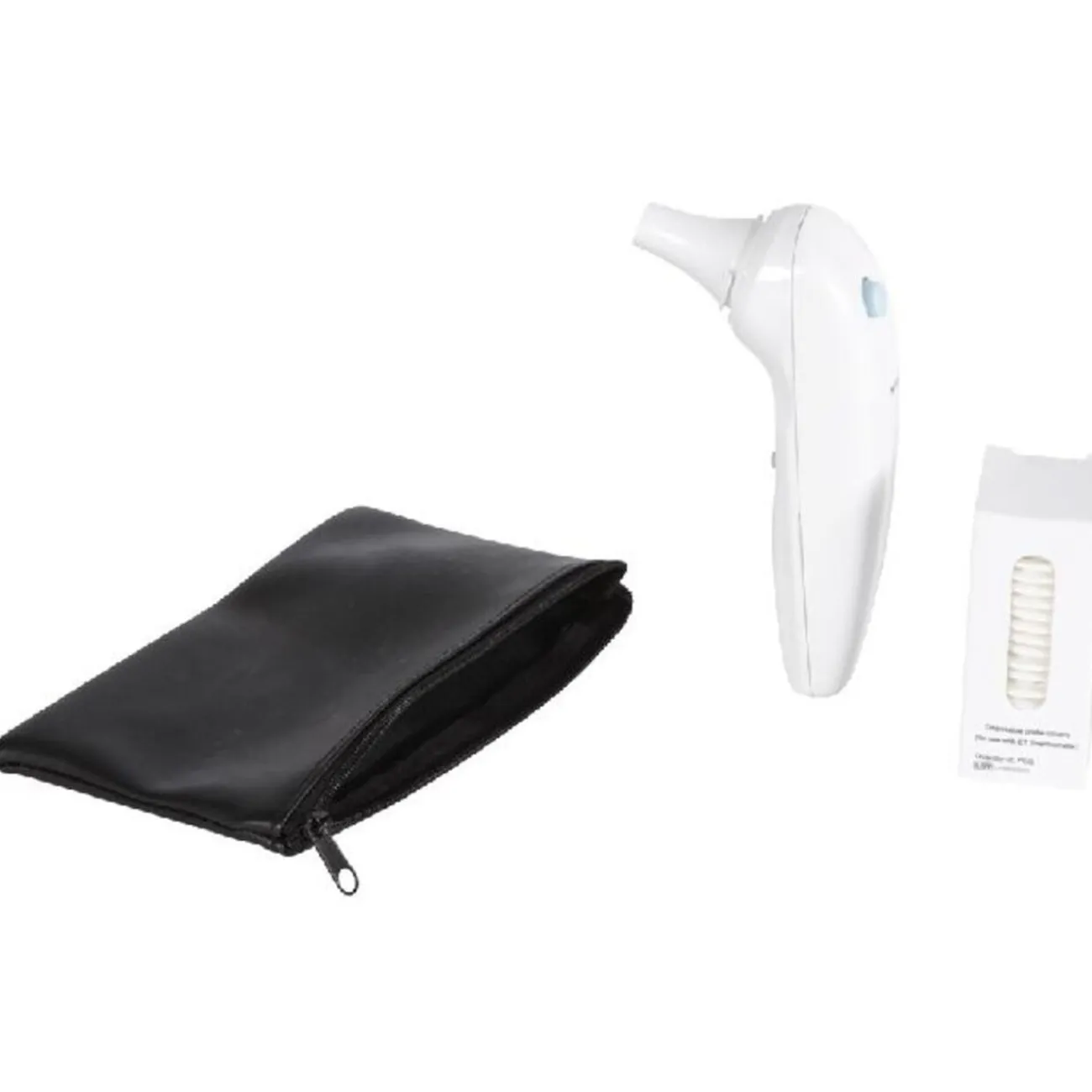 Thermomètre auriculaire à infrarouge, 20 protections jetables de la sonde, lecture rapide et précise de la température, écran LCD, indications sonore, extinction automatique, étui de rangement, l. 13 cm, fonctionne avec 2 piles LR03 fournies..