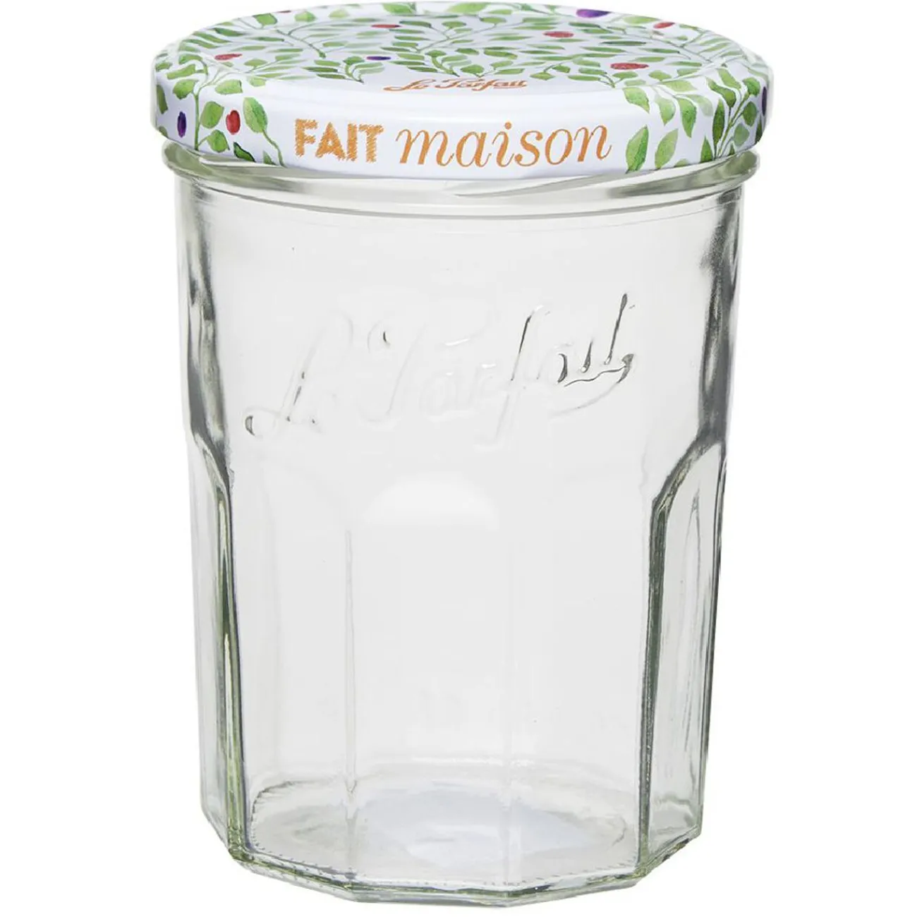 Confiturier Le Parfait en verre avec couvercle en métal multicolore.