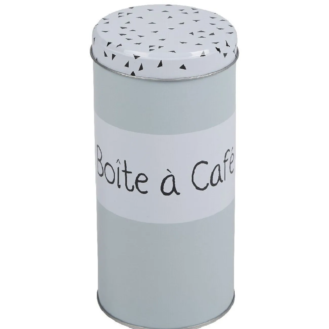 Boîte à café cylindrique vert d’eau avec couvercle blanc motifs triangles noirs.