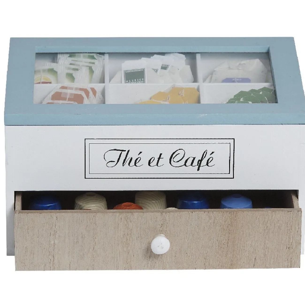 Boîte de rangement pour sachets de thé et dosettes de café.