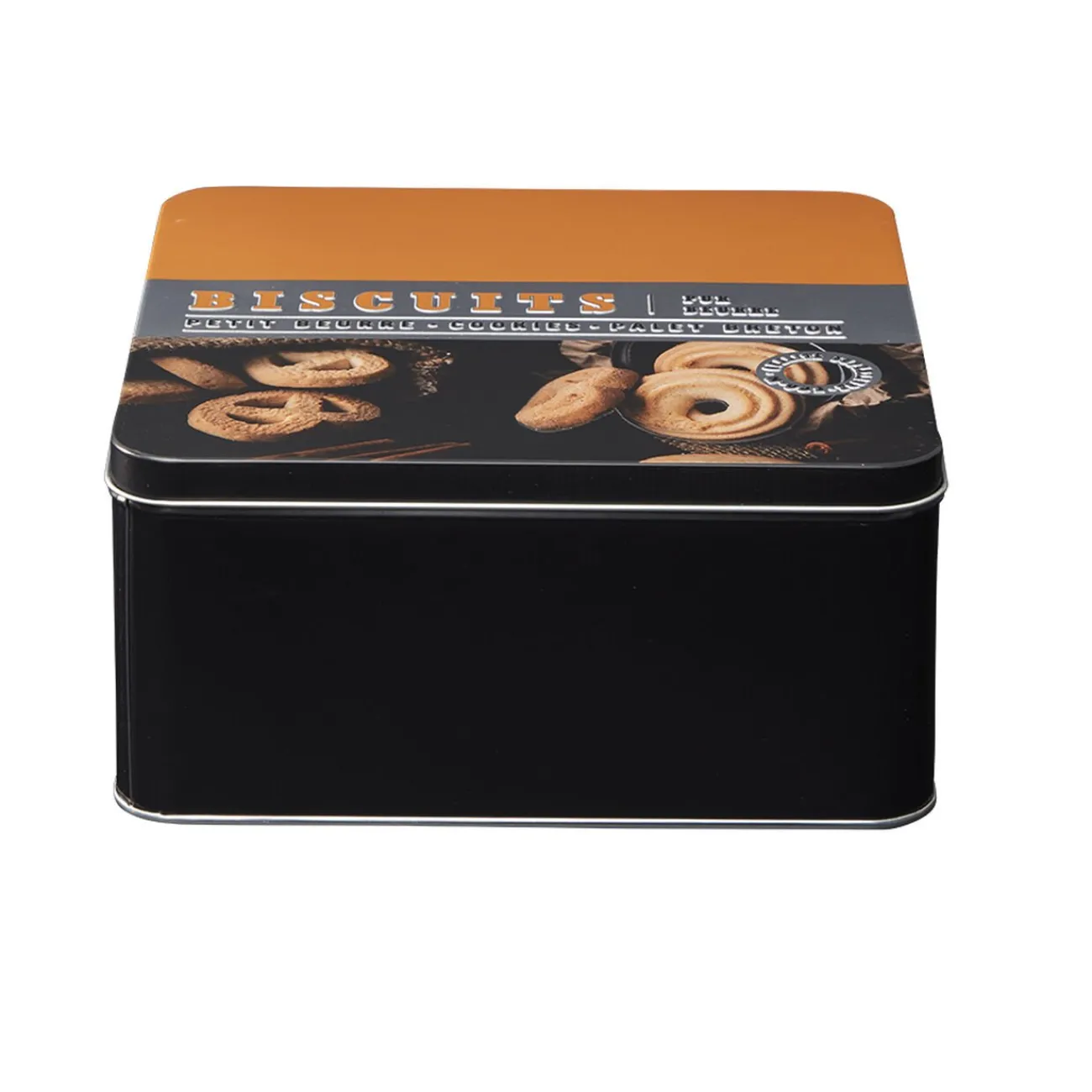 Boîte à gâteaux carrée en métal décorée d’inscriptions et d’illustrations dans les tons marron.